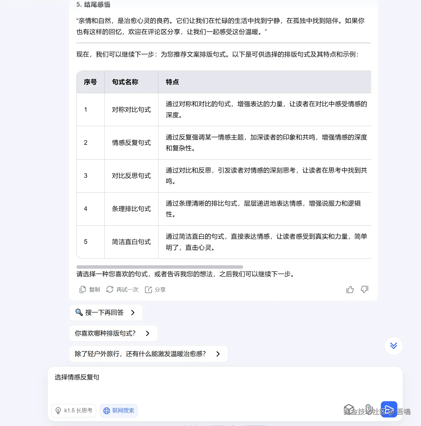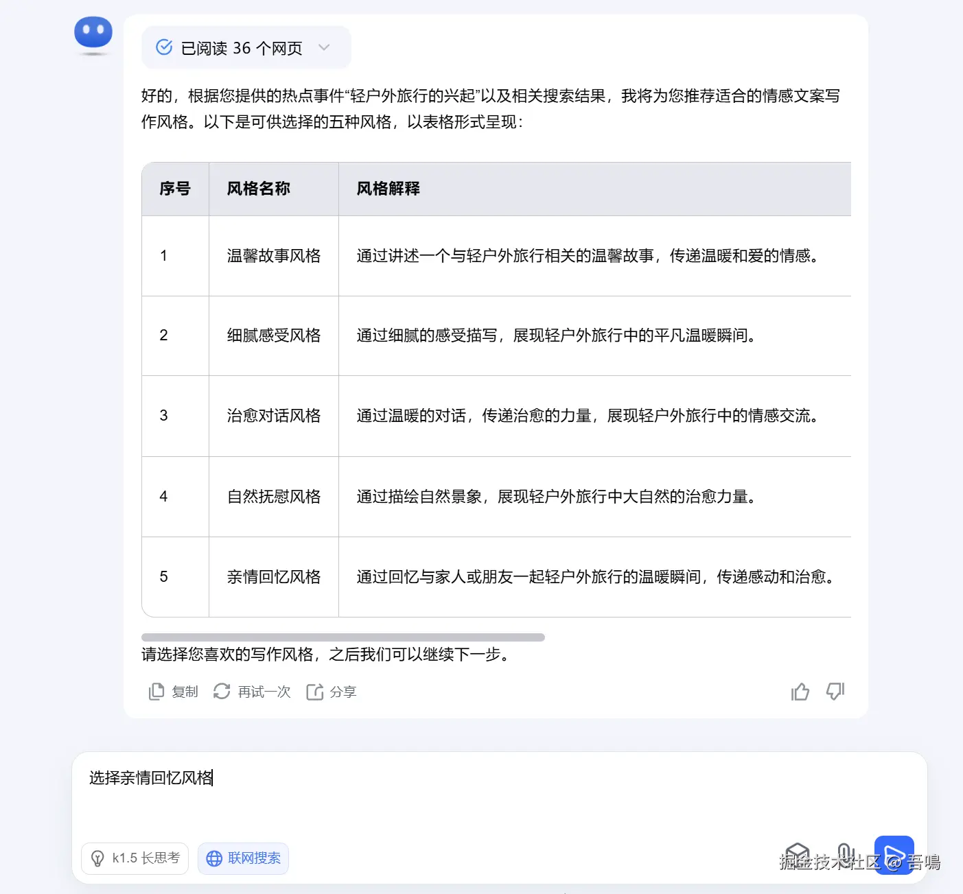 当你选择完创作的方向之后,那么就可以开始选择写作的风格了,提示词模板中提供了以下的几种选择,你可以按照你的需要进行选择,并在输入框中输入你的选择,发送告诉Kimi。