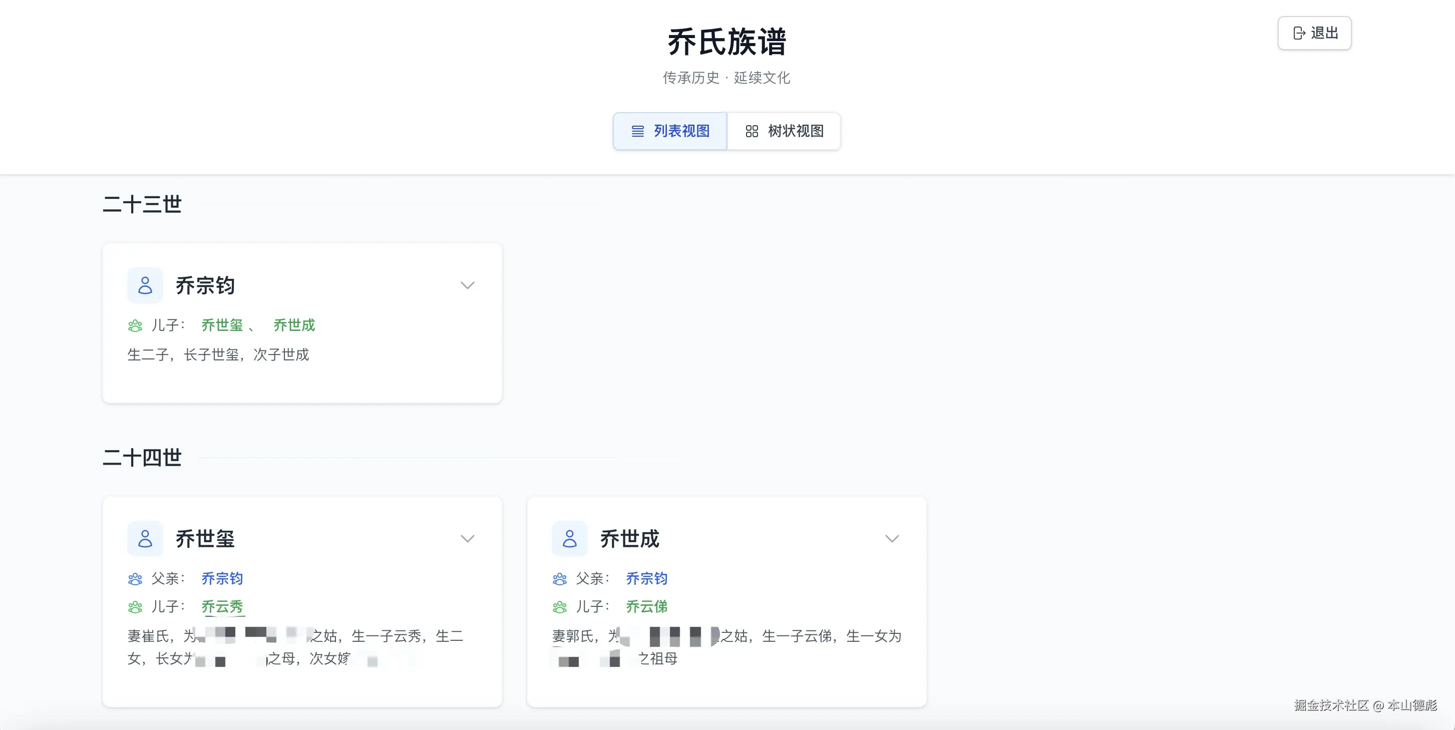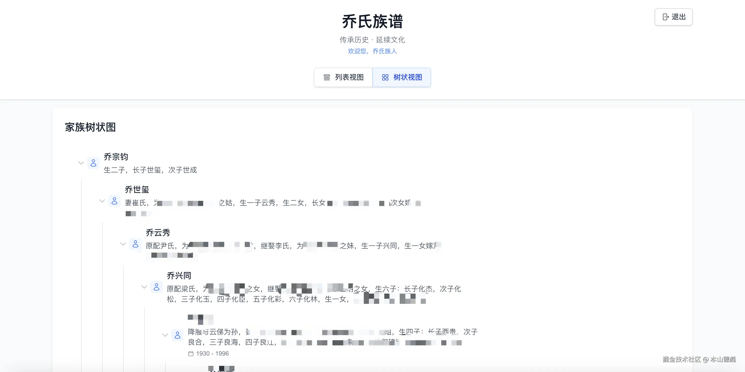既然讲到这里,顺便讲讲我这个族谱网站的功能吧。首先族谱提供了两种模式,列表模式和树状图模式。