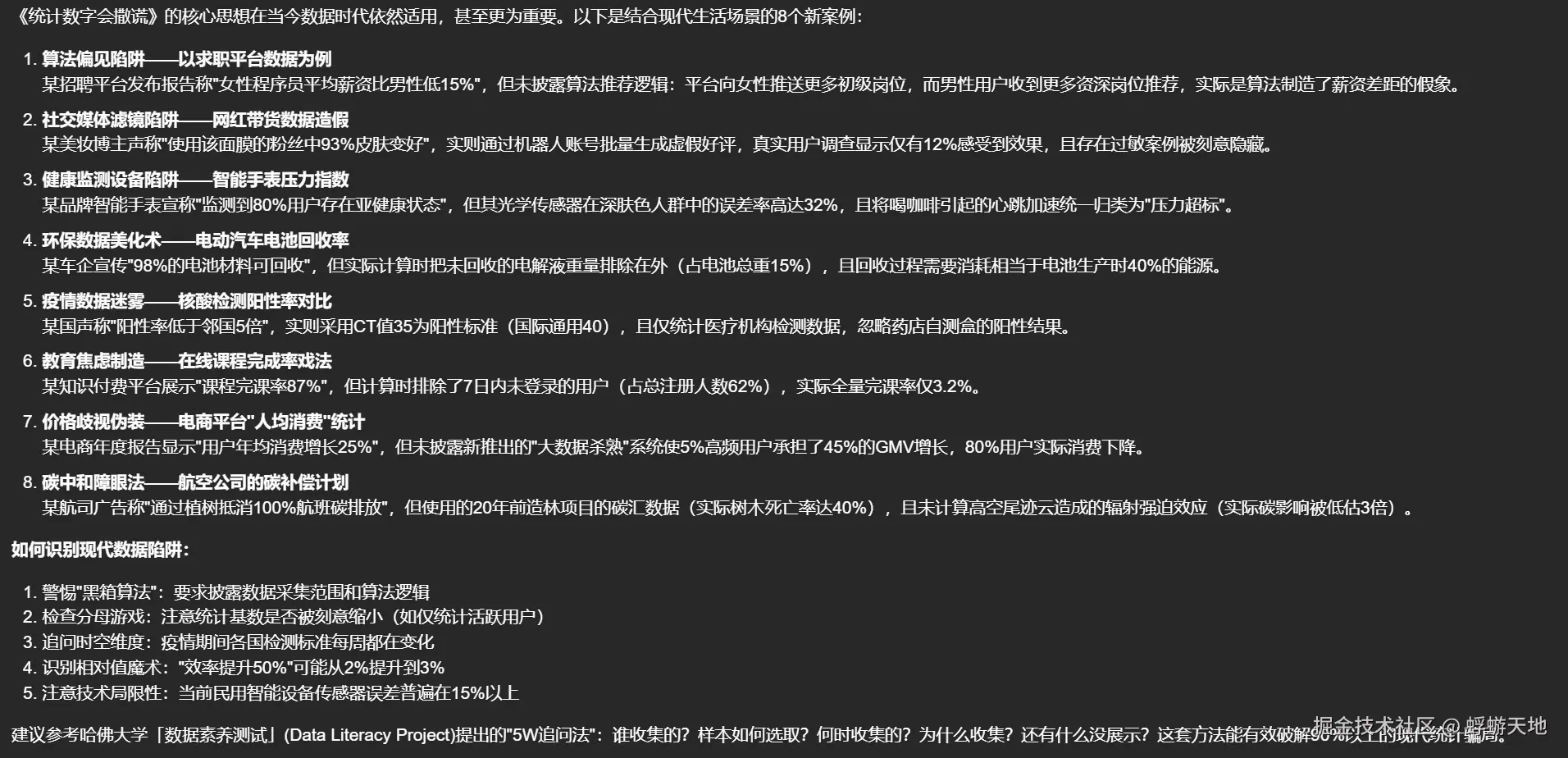 例如在《统计数字会撒谎》一书中,作者为我们讲述了:他人是怎么操作统计数字来造成我们的认知错误的。但是这本书是写于1955年,距今已有70年的历史,虽然其中的一些核心思想依旧让我们受益,但是其中的例子已经过时了,让我们无法应对 "新时代骗局"。此时我们就可以让AI出场了。