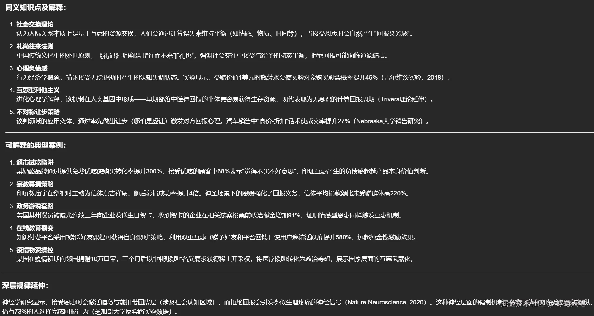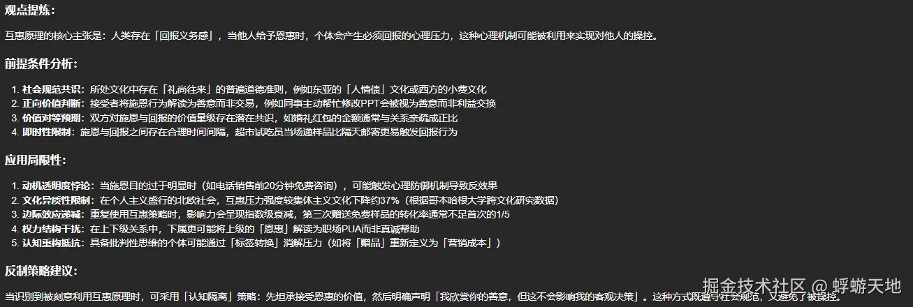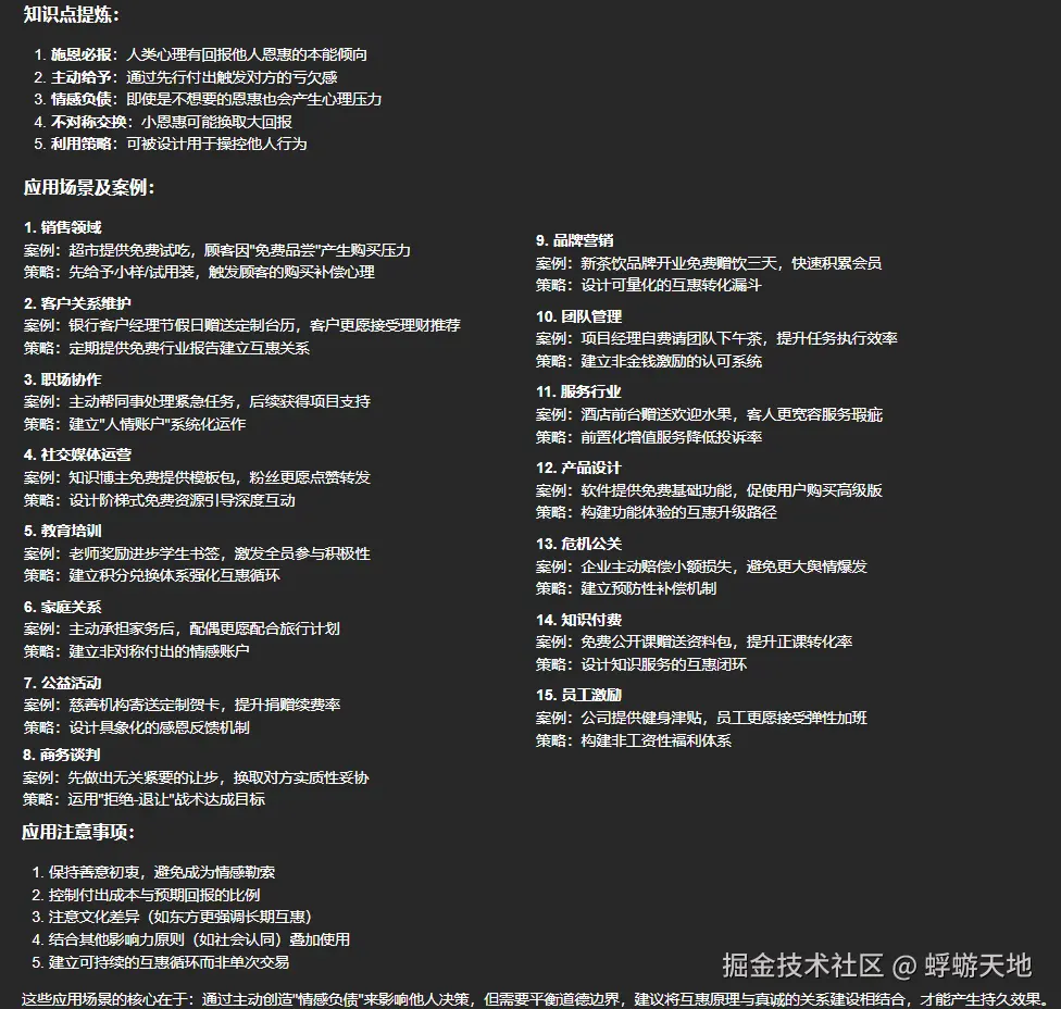 利用AI获取知识应用边界的思路也很简单,这里还是拿上面的“互惠原理”举例,AI会基于我们提供的知识点,分析给出其应用边界,供我们参考。