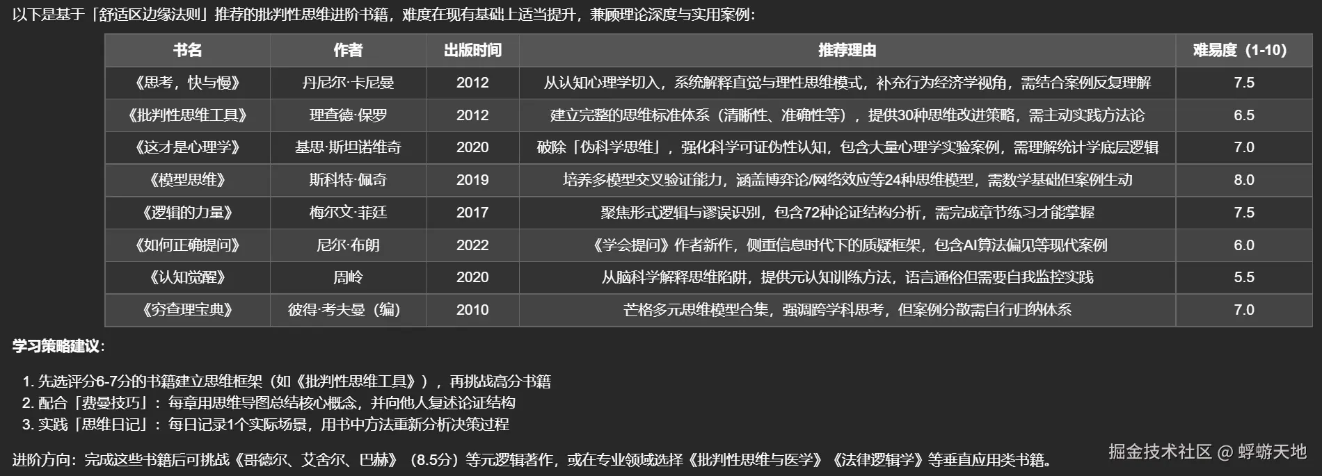 我是一名普通的大学生,我想要训练我的批判性思维,我已经阅读过《学会提问》《统计数字会撒谎》还有没有别的书籍推荐?请你根据舒适区边缘法则,为我推荐处于拉伸区的书,让我快速成长。请给出你推荐的书名、作者、出版时间、推荐理由、难易度评分。最终以表格的形式输出。