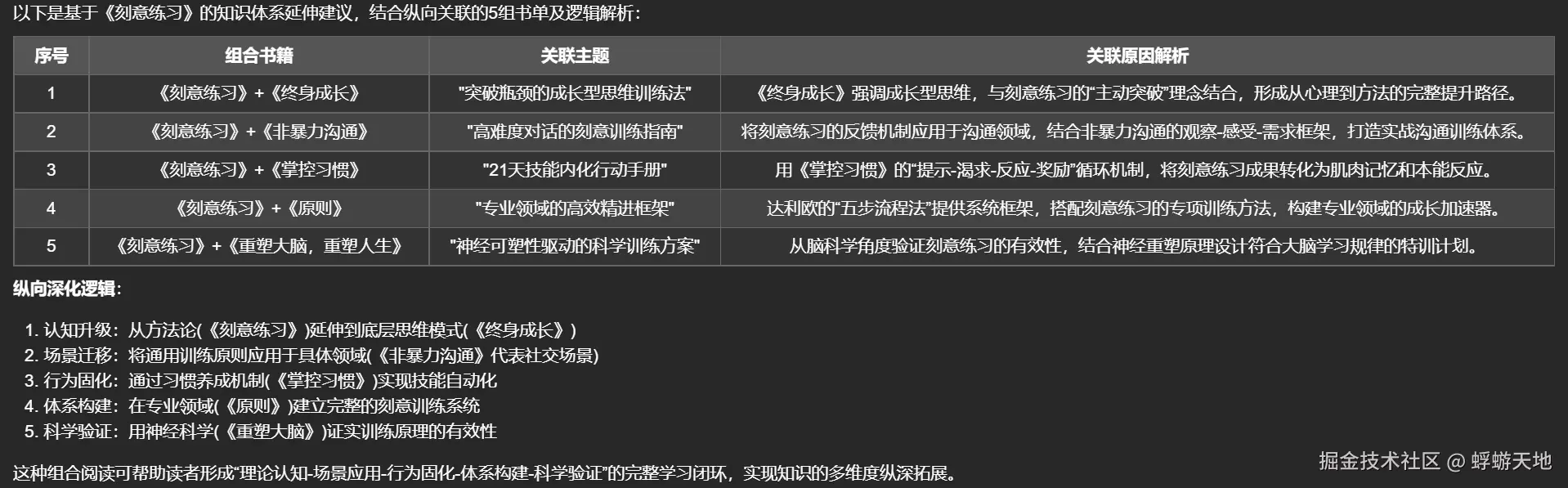 我已经阅读完了《刻意练习》这本书,接下来我读那本书可能形成纵向关联,举5个例子,并说明你这样关联的原因,用表格形式输出。