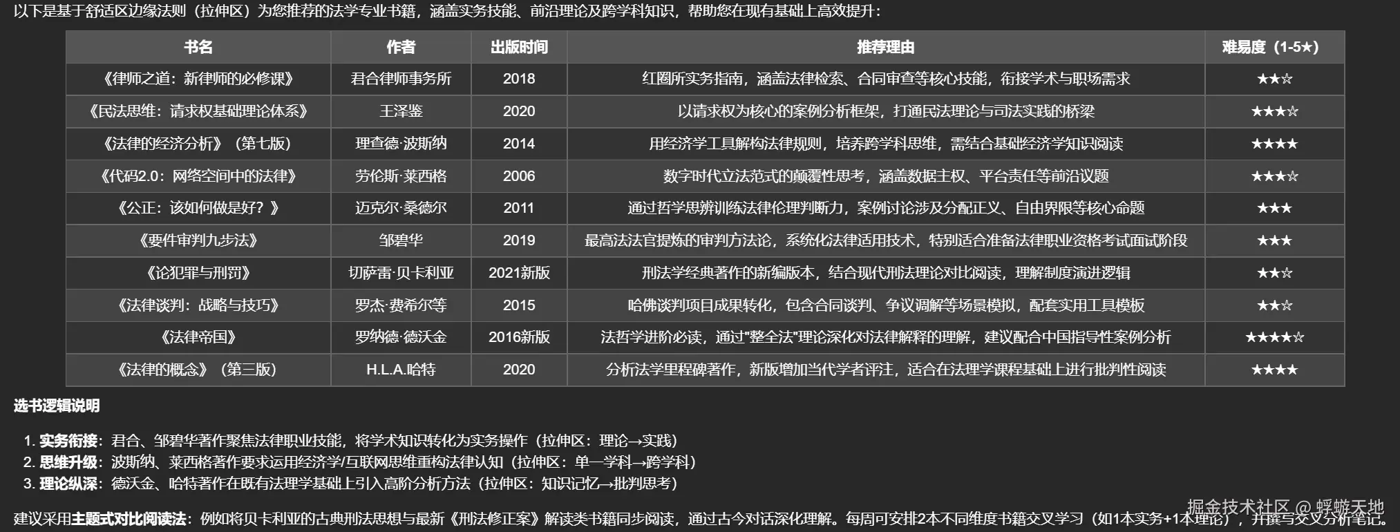 我是一名法学院的研究生,在大学里面接受过法学相关的系统培训,我现在要就业,需要阅读一些更专业性的书籍来提高我的能力,请你根据舒适区边缘法则,为我推荐处于拉伸区的书,让我快速成长。请给出你推荐的书名、作者、出版时间、推荐理由、难易度评分。最终以表格的形式输出