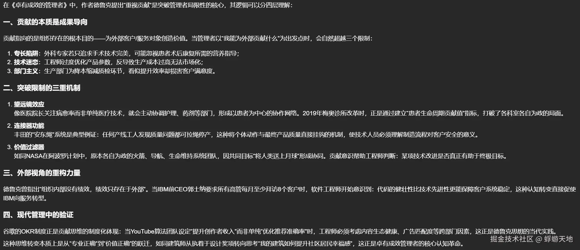 我在阅读《卓有程序的管理者》一书时,书中提到了以下内容,作者为什么认为“重视贡献”能帮助管理者突破自身专长、技术和部门的限制?