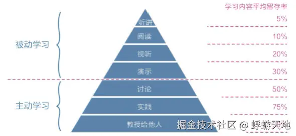 被动学习:如听讲、阅读、视听、演示,这些活动对学习内容的平均留存率为5%、10%、20%和30%。