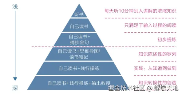 这个模型很好地展示了不同学习深度和层次之间的对比。反观自身的学习,我们同样可以清晰地划分出不同的层次。如图所示,以阅读为例,从浅到深依次为:听书、自己读书、自己读书+摘抄金句、自己读书+思维导图/读书笔记、自己读书+践行操练、自己读书+践行操练+输出教授。