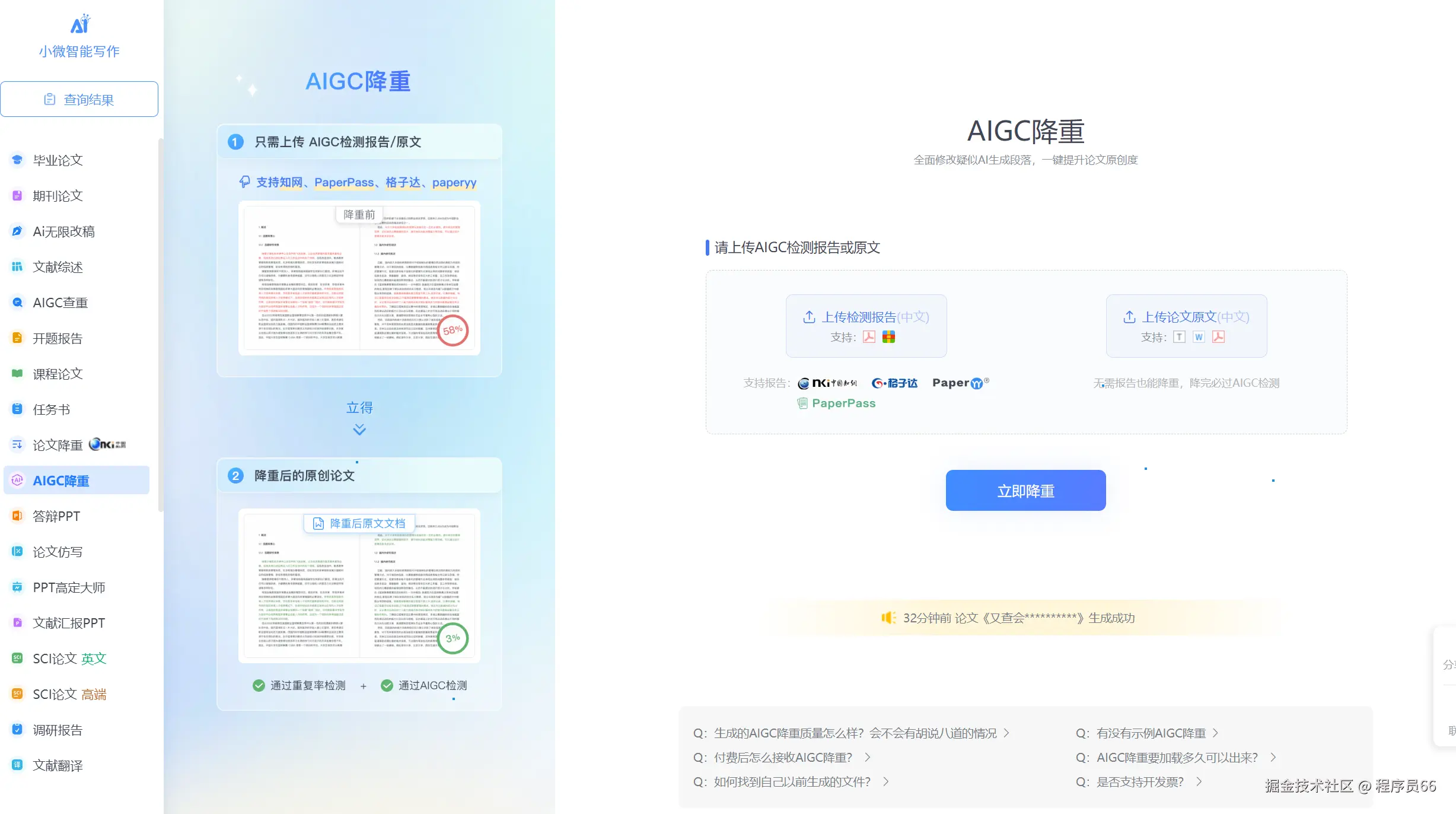 最后说说小薇智能写作,它本质是个写作软件,能够智能生成报告、开题、论文等内容,同时也支持降低AIGC率,在写作的同时帮你解决AI率过高的担忧。