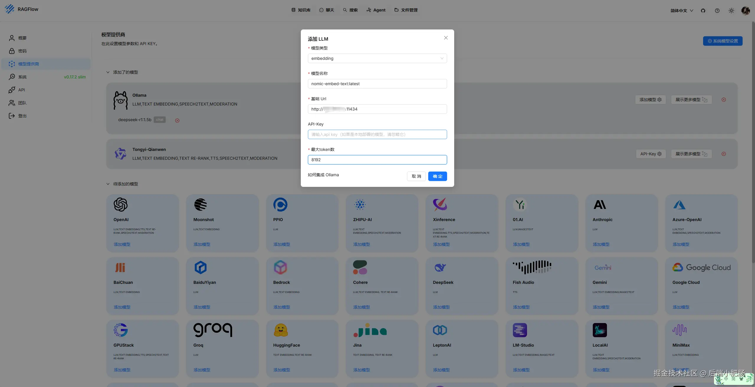 配置embedding模型,基础uri处配置为http://你的ip:11434: