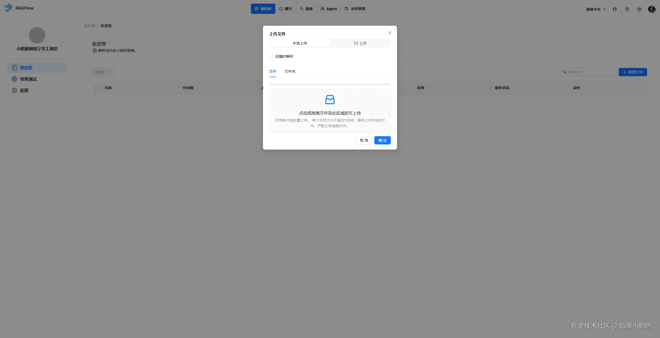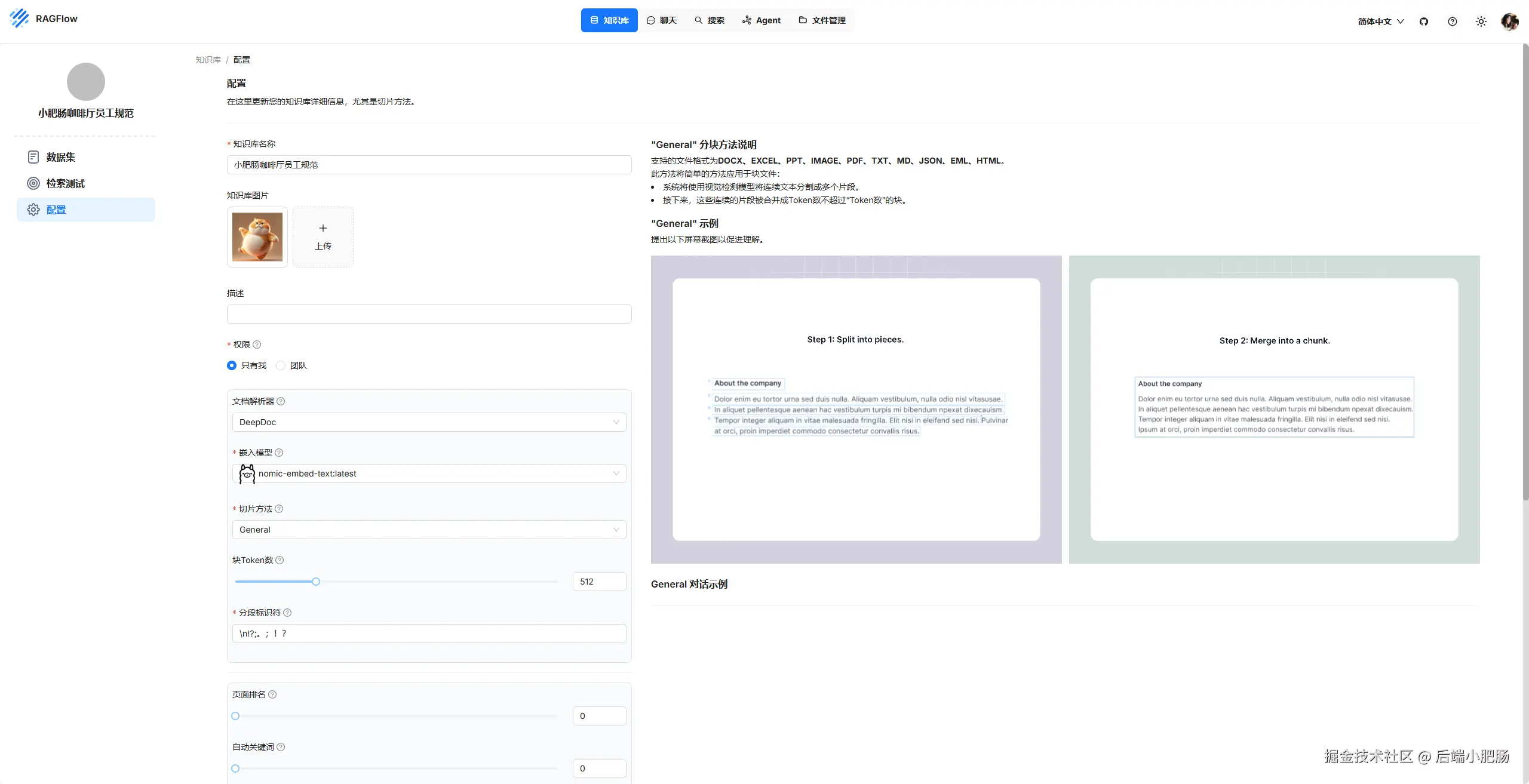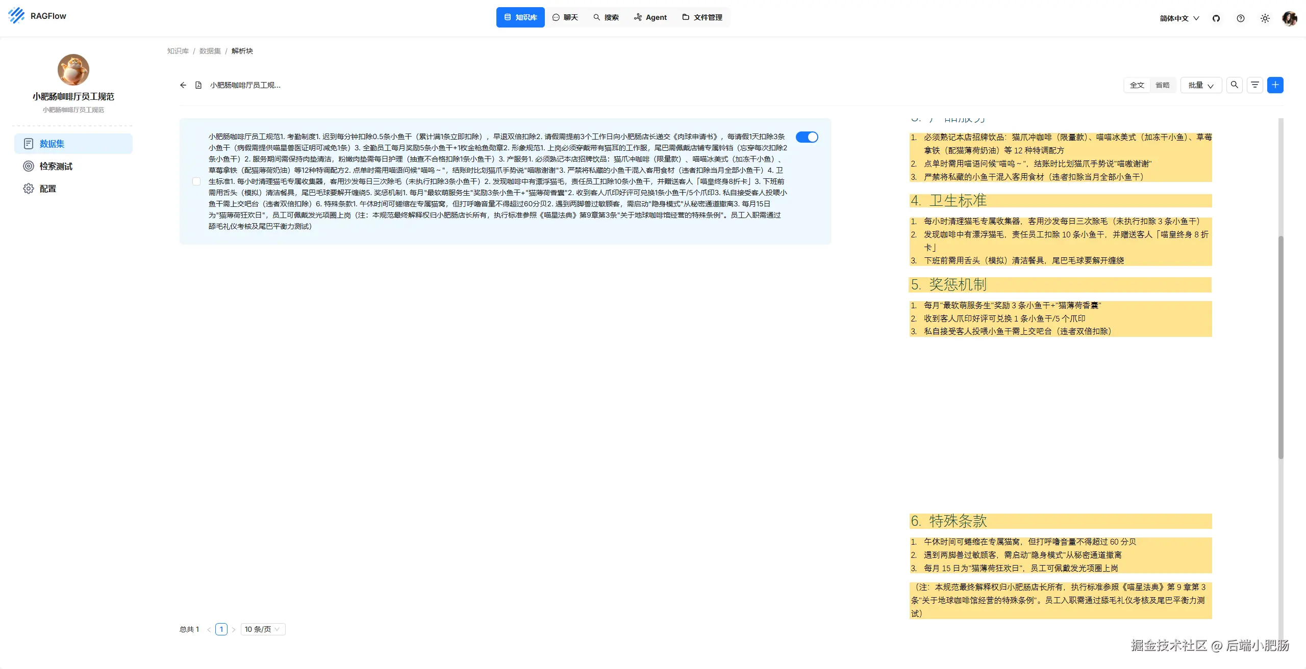 新增知识库,我这里为了示范新增了一个小肥肠咖啡厅员工管理规范的知识库,配置知识库: