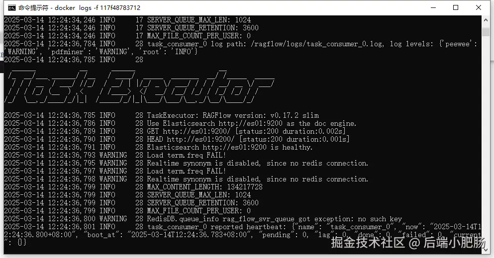 运行命令:docker compose -f docker-compose.yml up -d安装RAGFlow,安装完以后可以使用docker ps看一下容器列表,找到RAGFlow容器id,使用docker logs -f (容器id)查看容器运行情况: