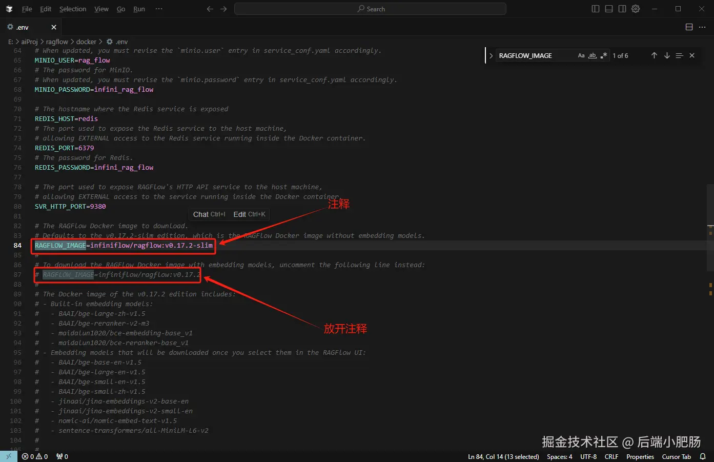 如需下载不同于 v0.17.2-slim 的 Docker 镜像,请在运行 docker compose 启动服务之前先更新 docker/.env 文件内的 RAGFlow_IMAGE 变量。比如,你可以通过设置 RAGFlow_IMAGE=infiniflow/RAGFlow:v0.17.2 来下载 RAGFlow 镜像的 v0.17.2 完整发行版。这里的版本是我自己的版本,你的版本需要打开.env软件自己确认。