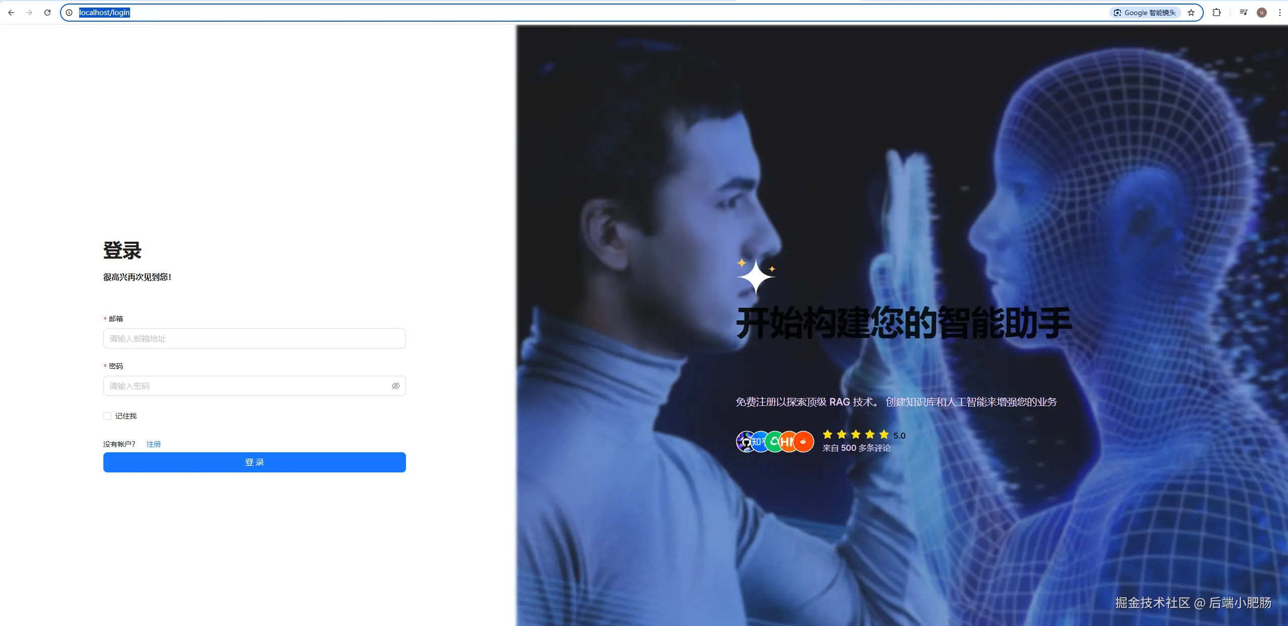 在浏览器输入localhost,能看到以下界面则表明RAGFlow安装成功了: