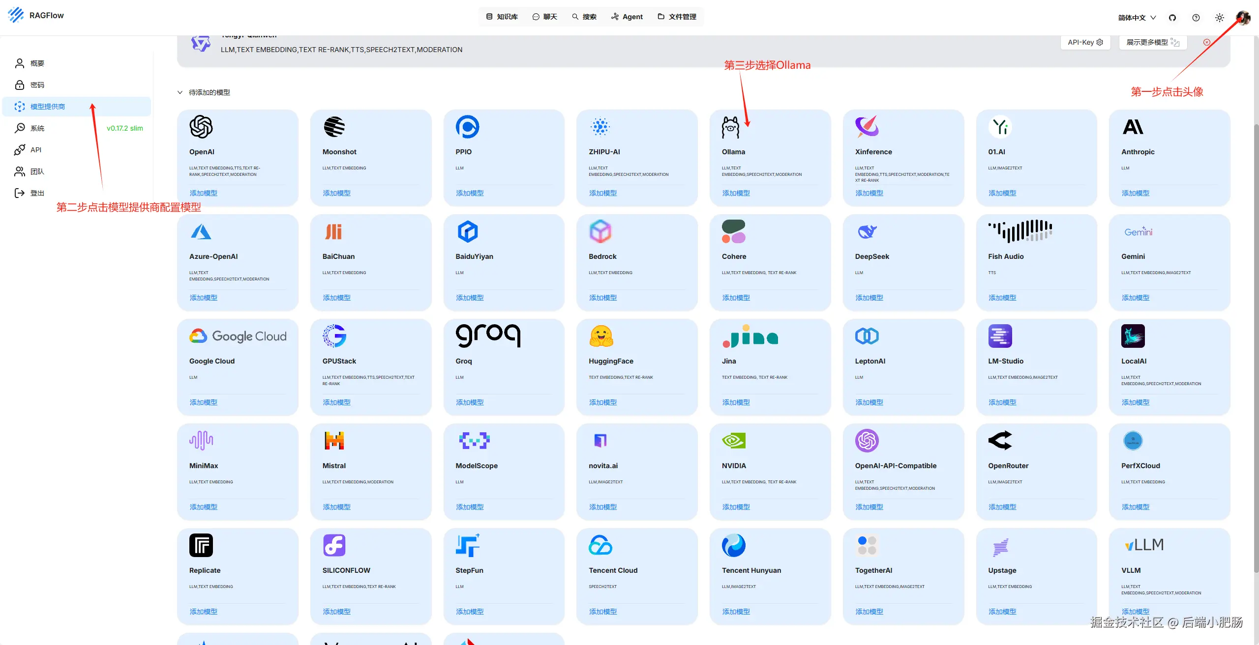 点击头像后,在侧边导航栏选择模型提供商,选择Ollama: