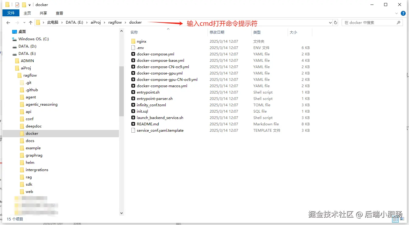进入RAGFlow/docker文件夹输入cmd打开命令提示符窗口: