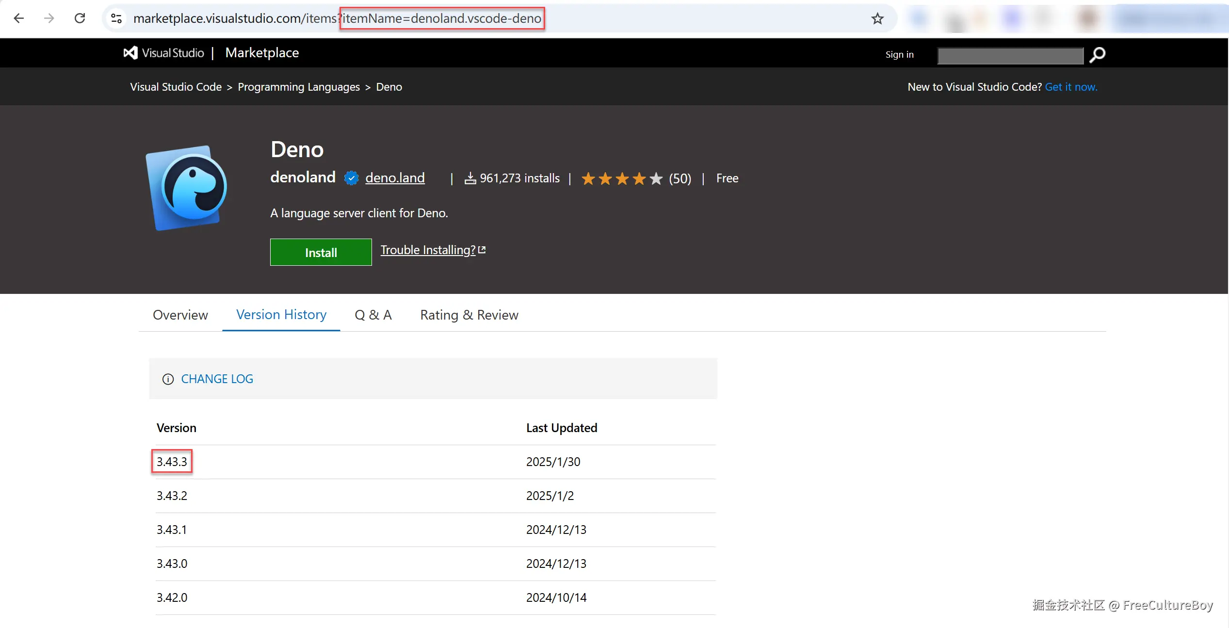 - 结合插件页的 URL 和 Version History 中的信息,提取出以下信息(以 Deno 为例):