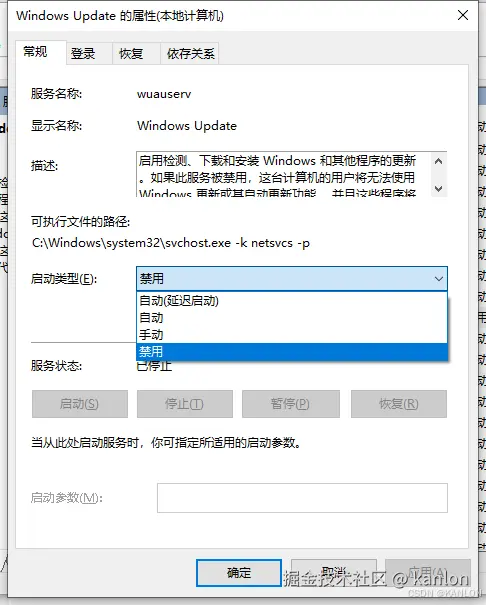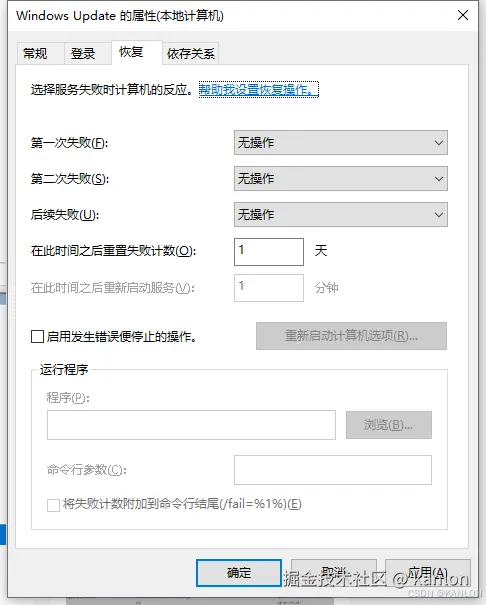 在“常规”选项卡,将“启动类型”修改为“禁用”;在“恢复”选项卡,将 第一次失败,第二次失败,后续失败都更新为“无操作”;然后点击“应用”和“确定”即可