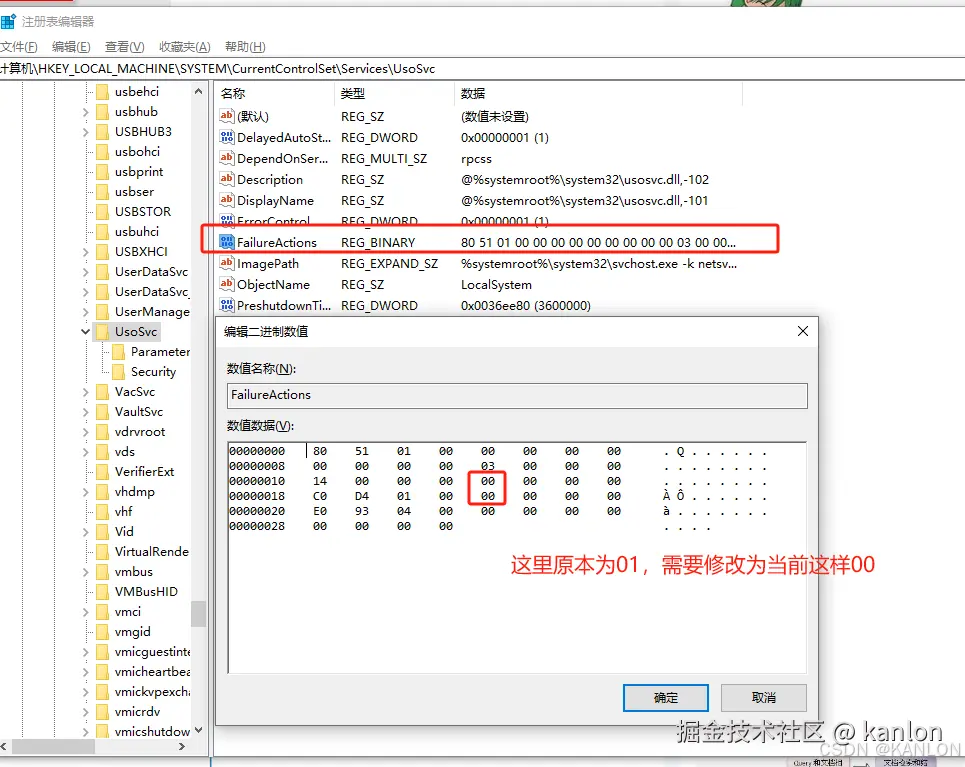 再在右侧找到 FailureActions键,双击修改该键的二进制数据,将“0010”、“0018”行的左起第5个数值由原来的“01”改为 00,点击下方的 “确定”,如图所示