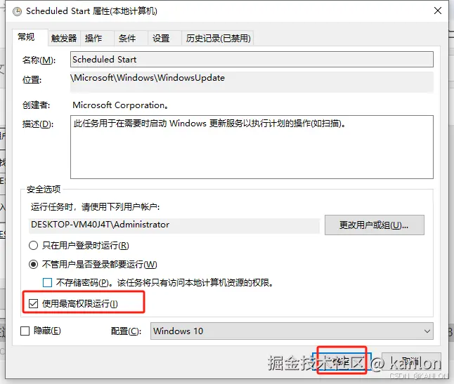 (5)回到计划任务项属性窗口中,勾选“使用最高权限运行”,点击“确定”按钮就可以了