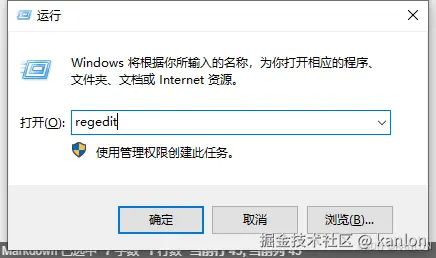 按下「Win+R」打开window运行窗口,打开运行对话框,输入命名 regedit,点击下方确定打开注册表,如下所示