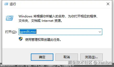 按下「Win+R」打开window运行窗口,打开运行对话框,输入命名 gpedit.msc,点击下方确定打开注册表,如下所示