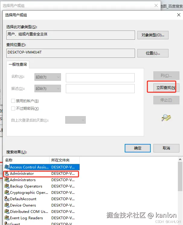 (2)点击“立即查找”,选中用户Administrator,然后点击确认