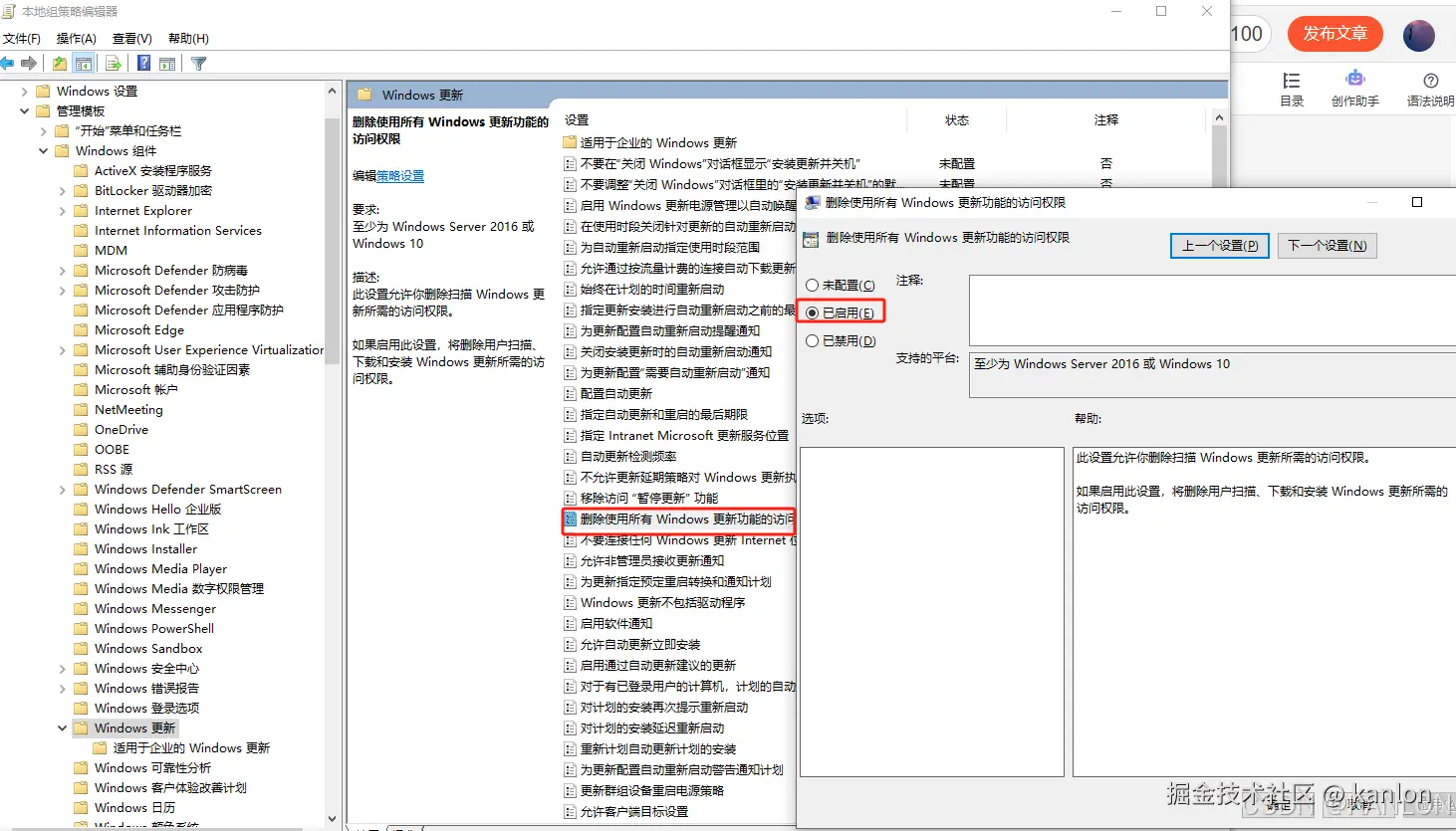 在Window 更新下,再选中 “删除使用所有Window 更新功能的访问权限”设置中,将其设置为“已启用”并点击下方的确定保存即可,如下所示