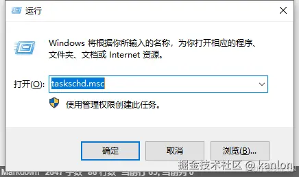 按下「Win+R」打开window运行窗口,打开运行对话框,输入命名 taskschd.msc,点击下方确定打开注册表,如下所示