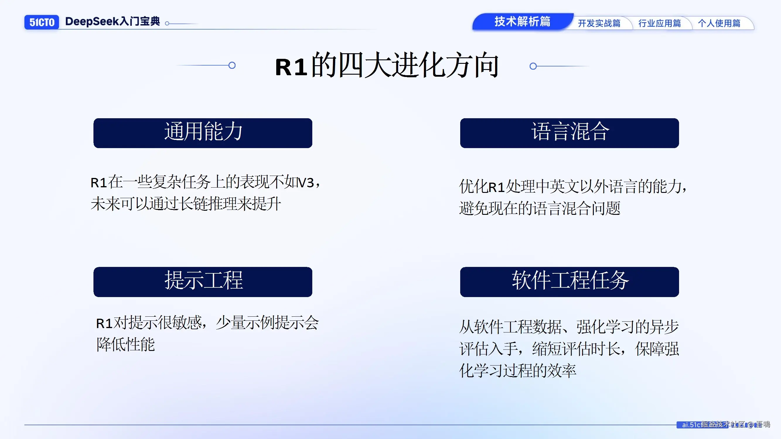 - 进化方向:提升复杂任务通用性(长链推理)、优化提示工程、解决多语言混合问题、强化软件工程任务能力(数据与异步评估优化)。