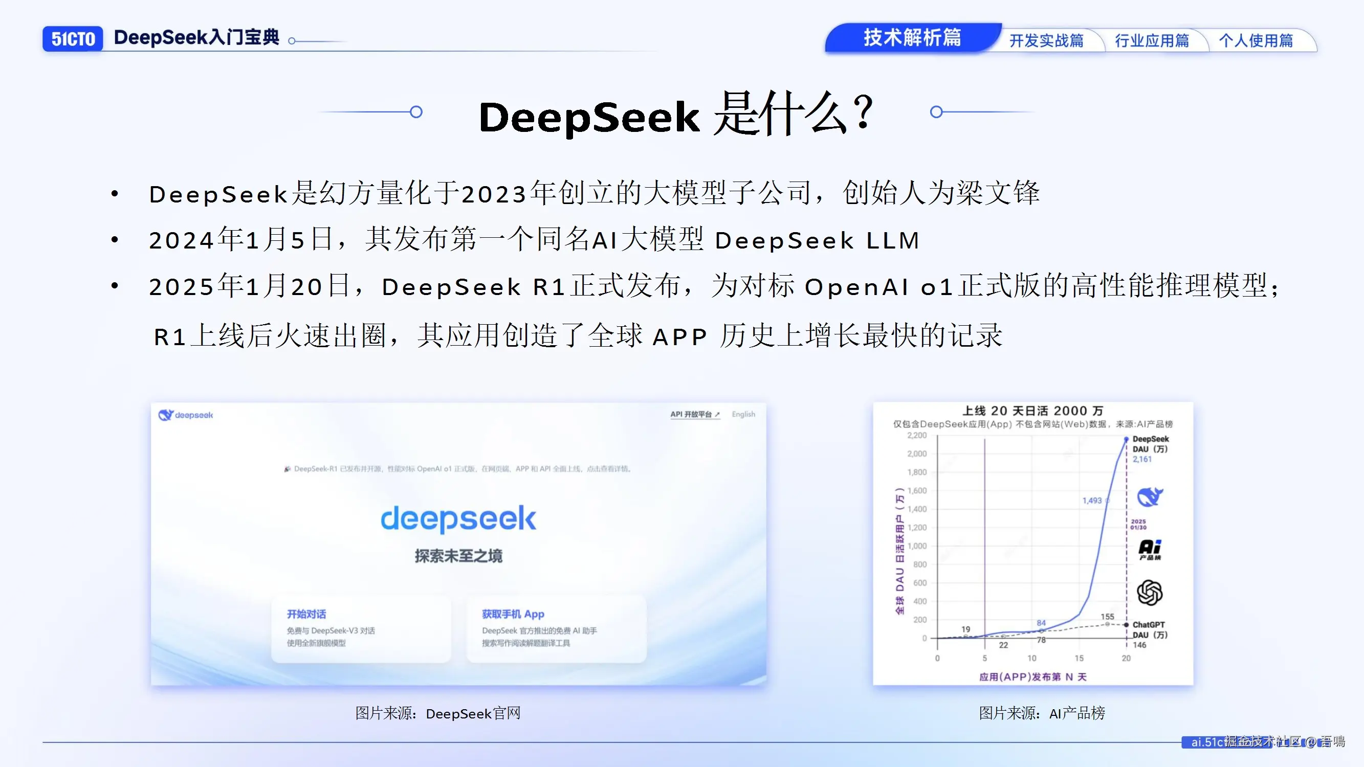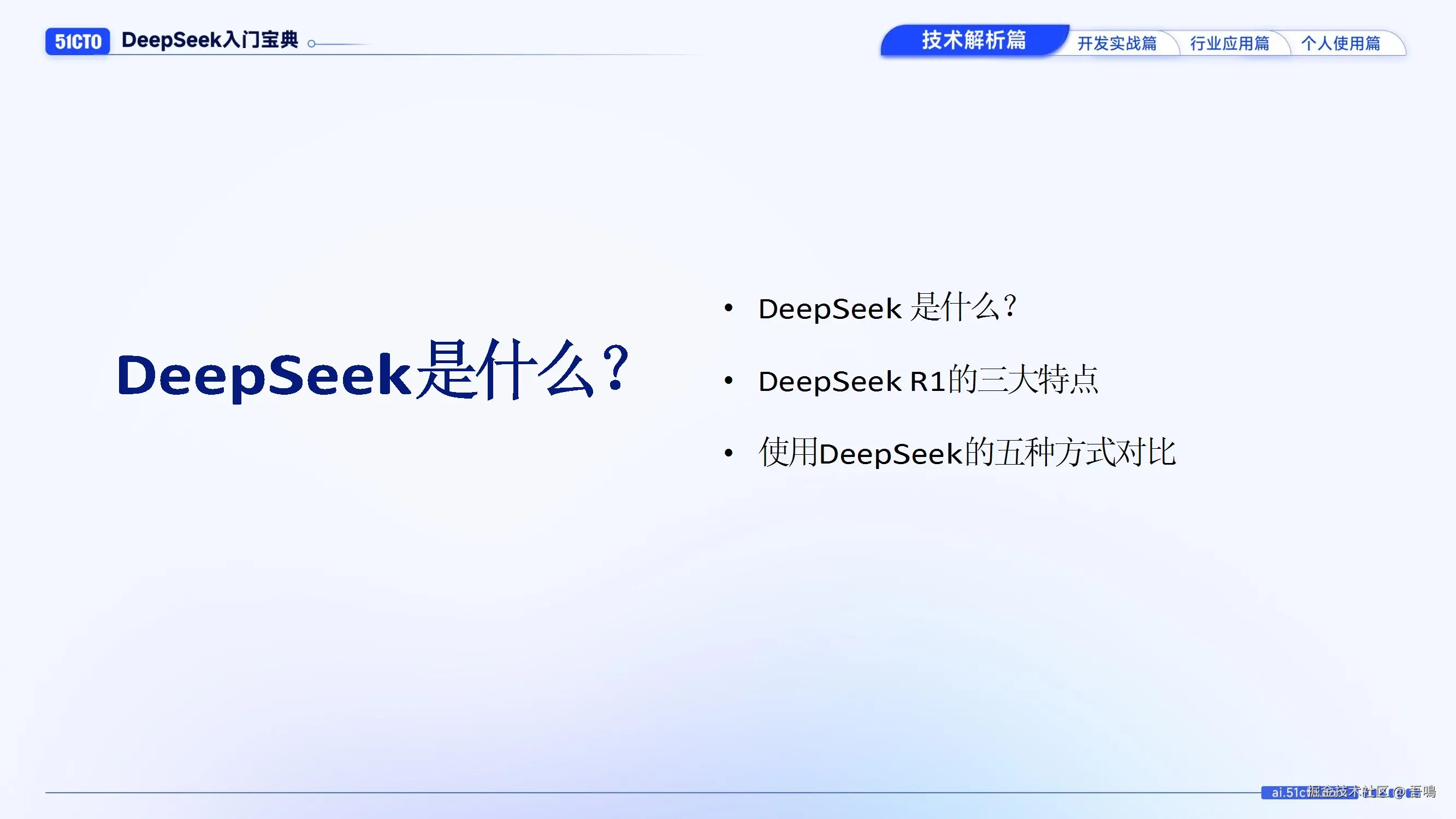 介绍DeepSeek的背景:由幻方量化于2023年创立,2024年发布首款AI大模型DeepSeek LLM,2025年推出对标OpenAI o1的高性能推理模型R1。强调其开源、低成本(开发成本仅为OpenAI的2%)和高性能(推理表现媲美OpenAI o1)三大特点,并对比普通用户与开发者使用DeepSeek的五种方式(官网、API、本地部署、云平台等)。 - R1核心技术解析