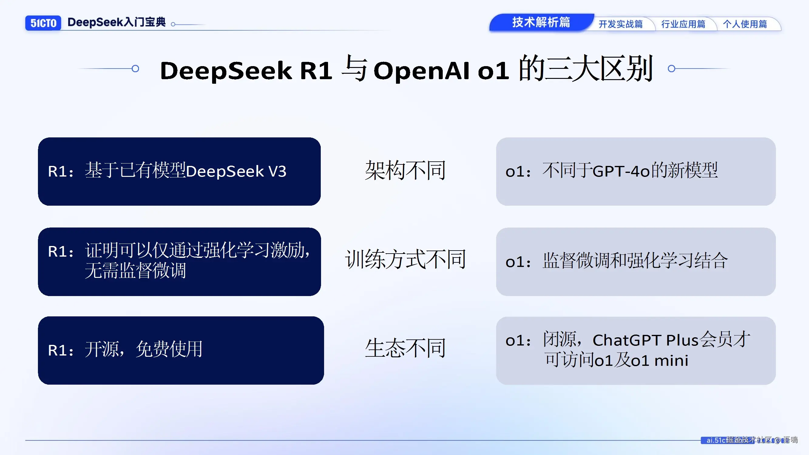 - 三大区别:基于已有模型V3、纯强化学习训练、开源生态。