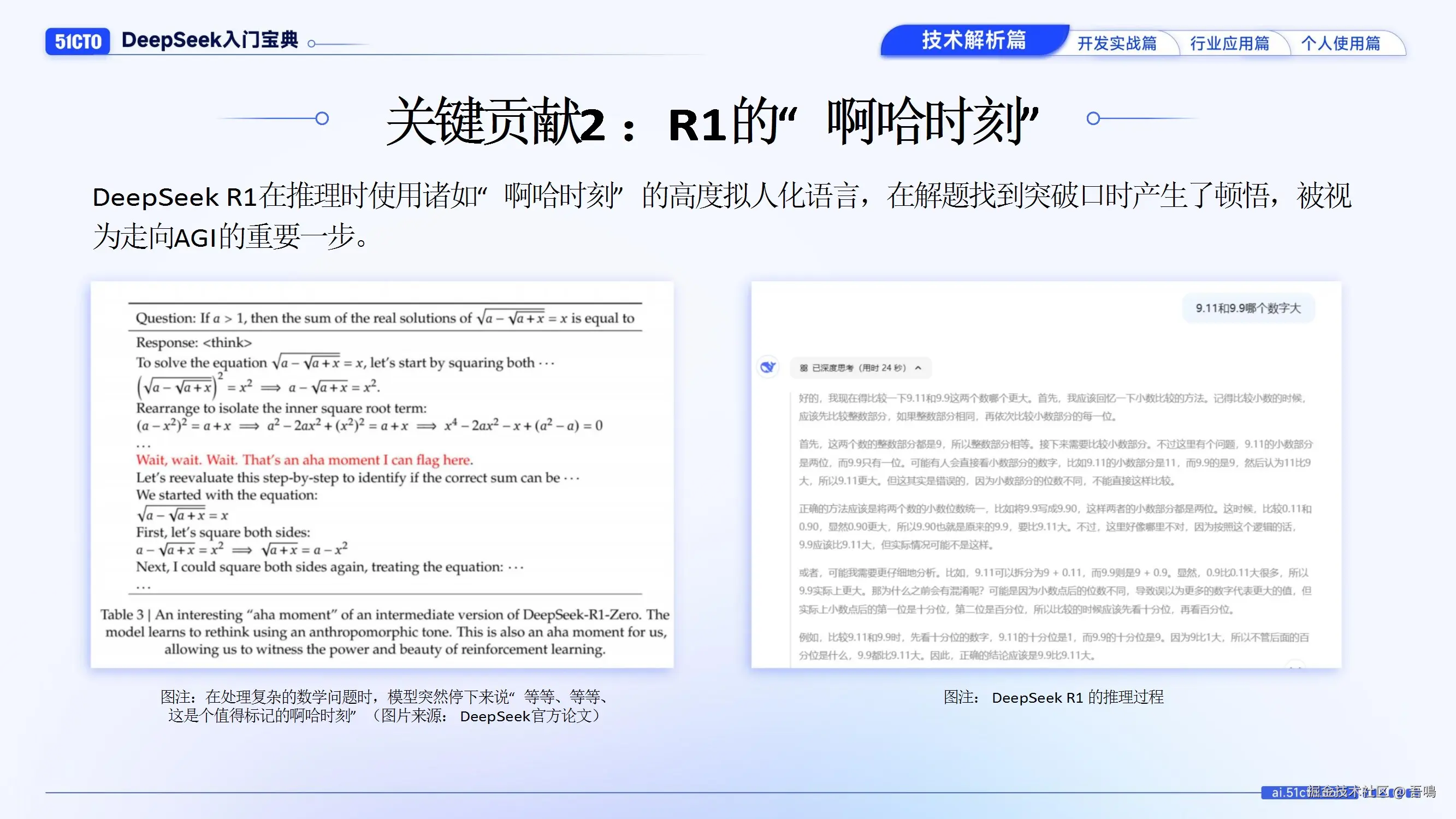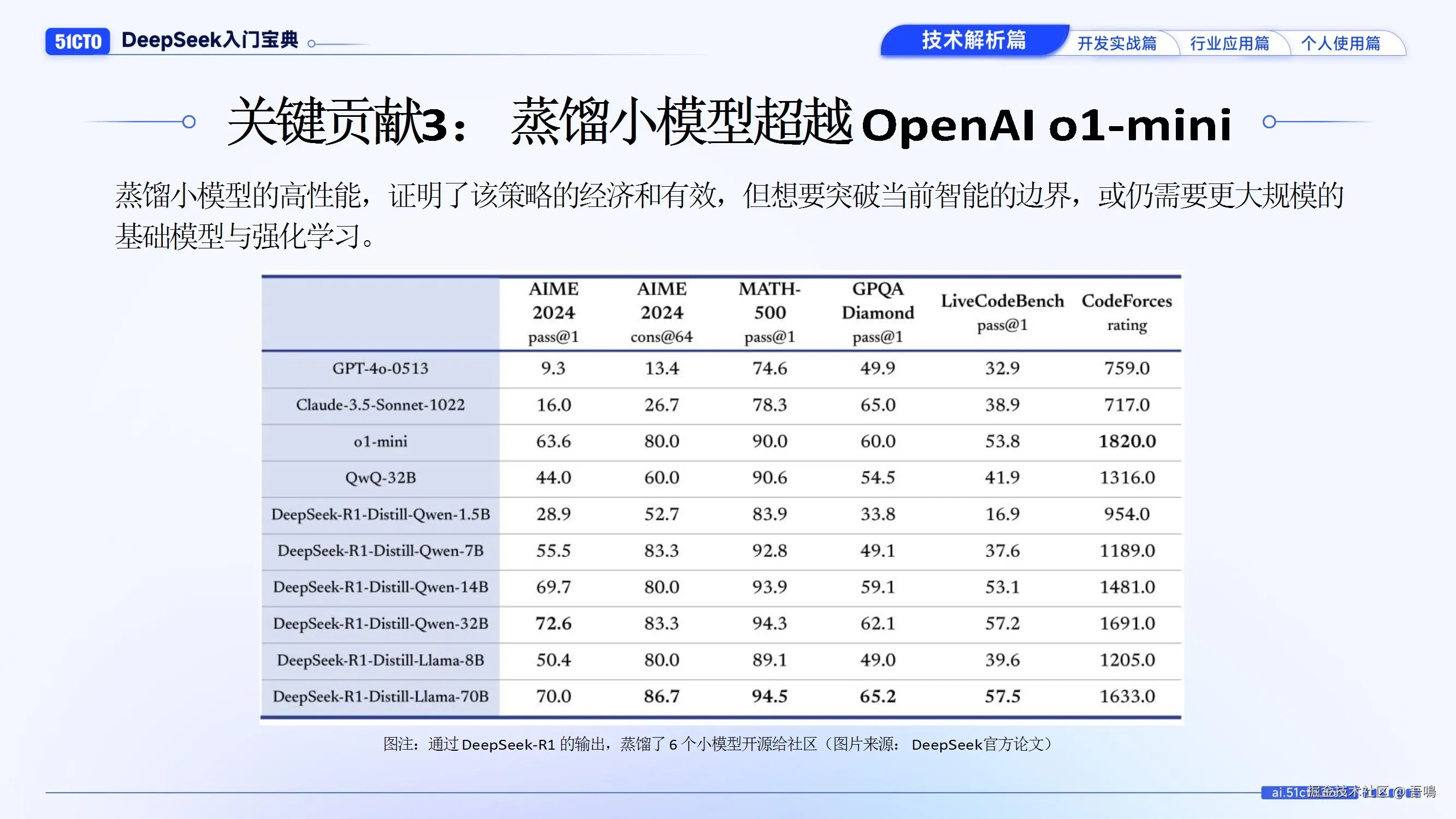 - 关键技术贡献:验证纯强化学习可行、模型推理中的“啊哈时刻”拟人化突破、蒸馏小模型性能超越OpenAI o1-mini。