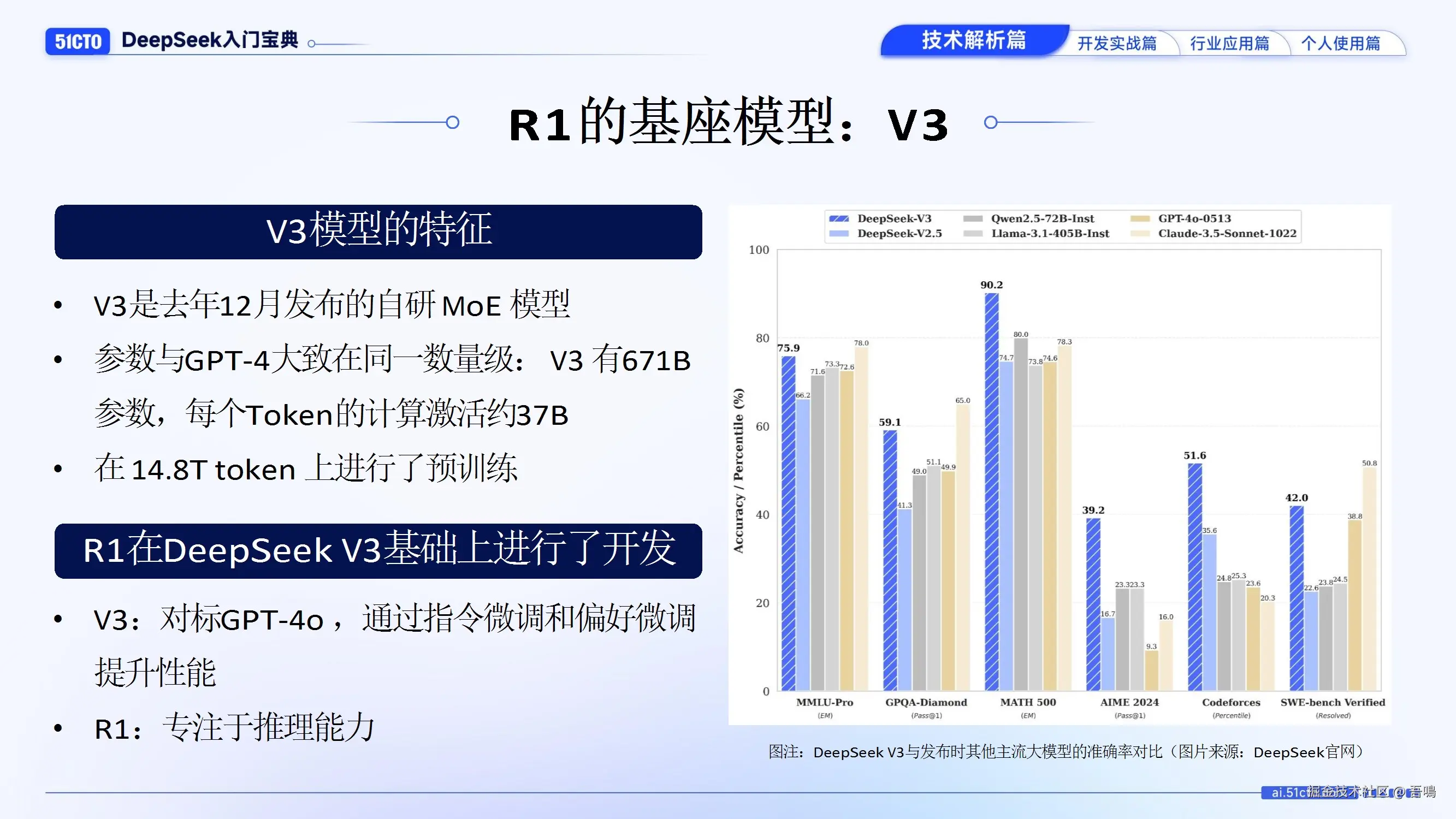 - 基座模型V3:参数规模与GPT-4相当(671B),基于MoE架构,通过指令微调和偏好微调提升性能。