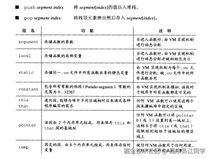 内存访问命令使用命令 pop 和 push x 来表示,这里符号 x 代表在某个全局内存中的一个独立的存储单元。为了保留语义信息,VM 需要操纵 8 个独立的虚拟内存段,如下图所示: