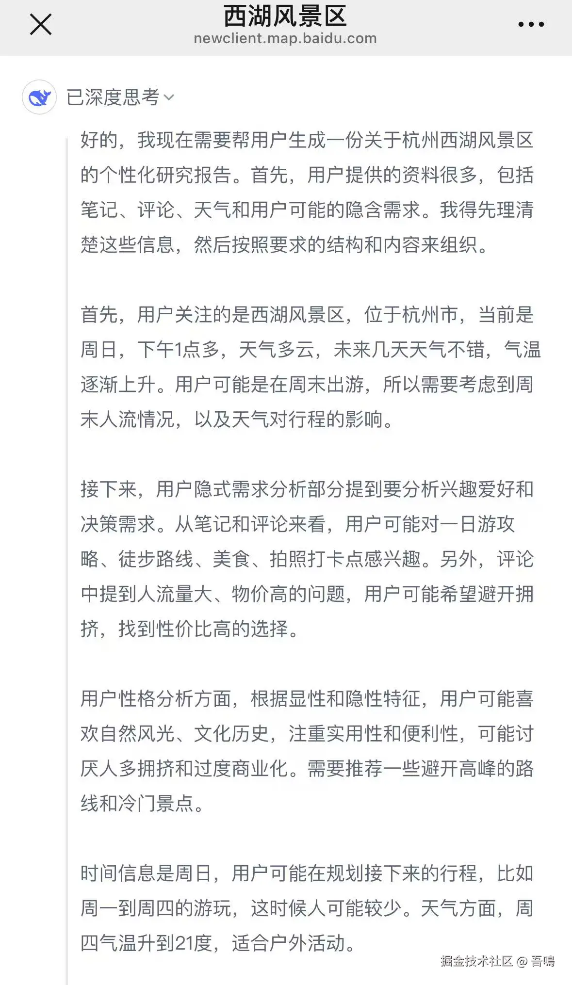 上面是吾鳴输入了西湖风景区之后,点击DeepSeek,DeepSeek根据我的习惯数据准备给我输出一份个性化研究报告,结合天气、兴趣爱好、用户的性格等规划行程。上面是它的思考过程,经过它的一段思考分析之后,给我输出了下面的报告。