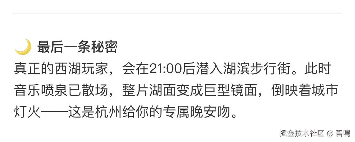报告最后的一条秘密也是非常的走心,特别是在夏天的时候,在晚上在西湖边上溜达闲逛,那是非常的惬意的,这会儿人已经都走了,人不多,西湖的风吹过来非常的舒服。但是是不是得考虑下季节,这个时间推荐这个还是早了,因为这个时间点杭州还是比较冷的,晚上建议躲被窝里,哈哈!