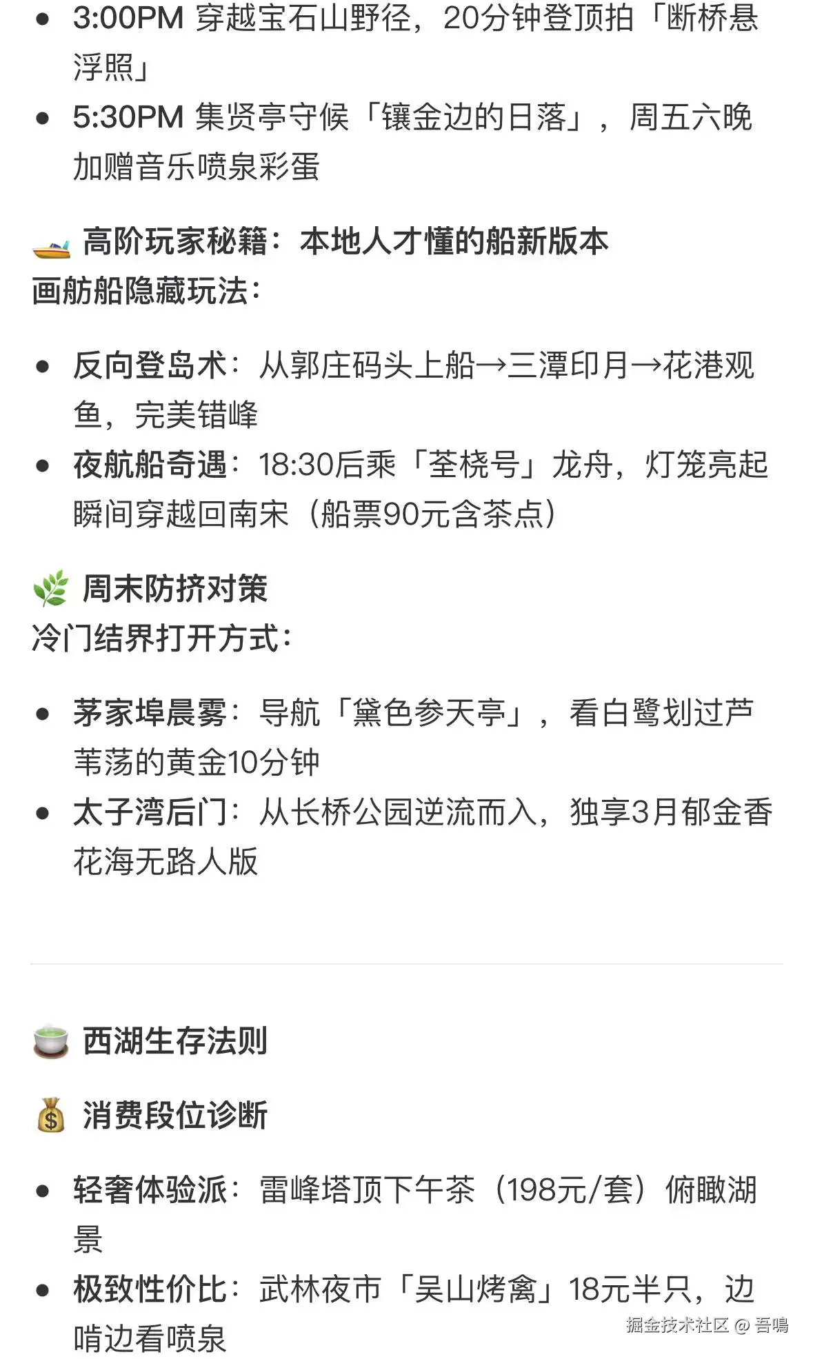 在它给出的报告中,可以看到它其实知道我的核心需求,而且还给我制定了游玩的路线,路线中包括西湖景区的诸多景点之外,还给我规划了西湖周边的徒步路线,大概是我之前有使用过百度地图导航过西湖周边的徒步线路。同时还很温馨的告诉我后面几天的天气,还有西湖周边的美食价钱等,可谓是非常的接地气了。武林夜市里面的烤鸡价钱都知道,真的是非常的贴心了。