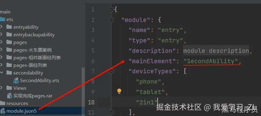 src/main/module.json5中 ->mainElement属性指向abilities属性中的UIAbility名字 - 调整