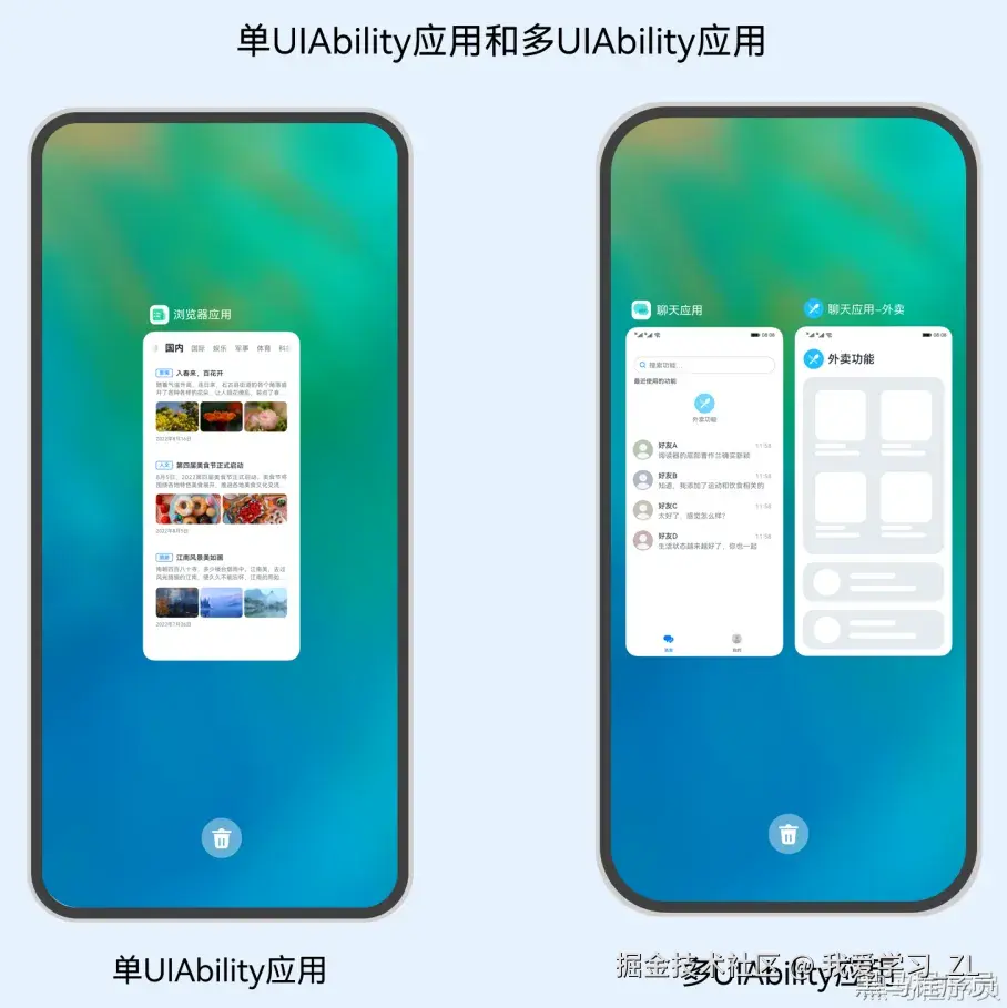 - 多UIAbility-> 在手机操作系统的任务列表中有多个任务窗口