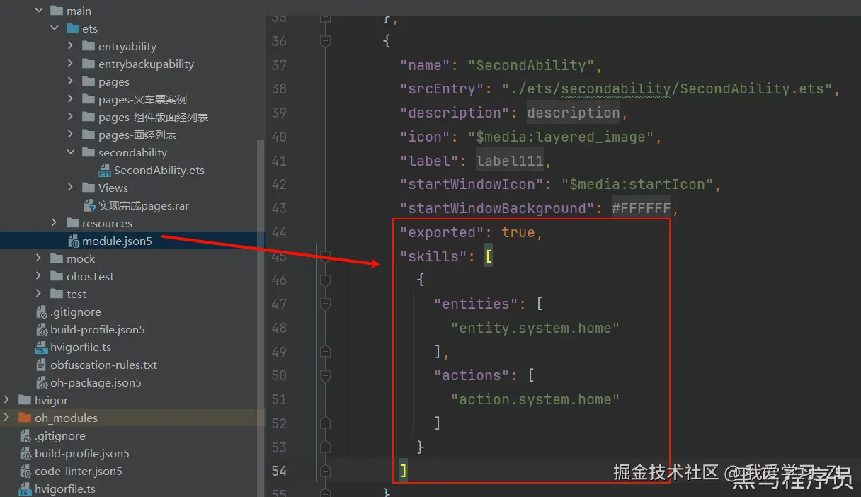 exported 与skills 只有一个用来说明该 UIability 具有调起其他页面的能力