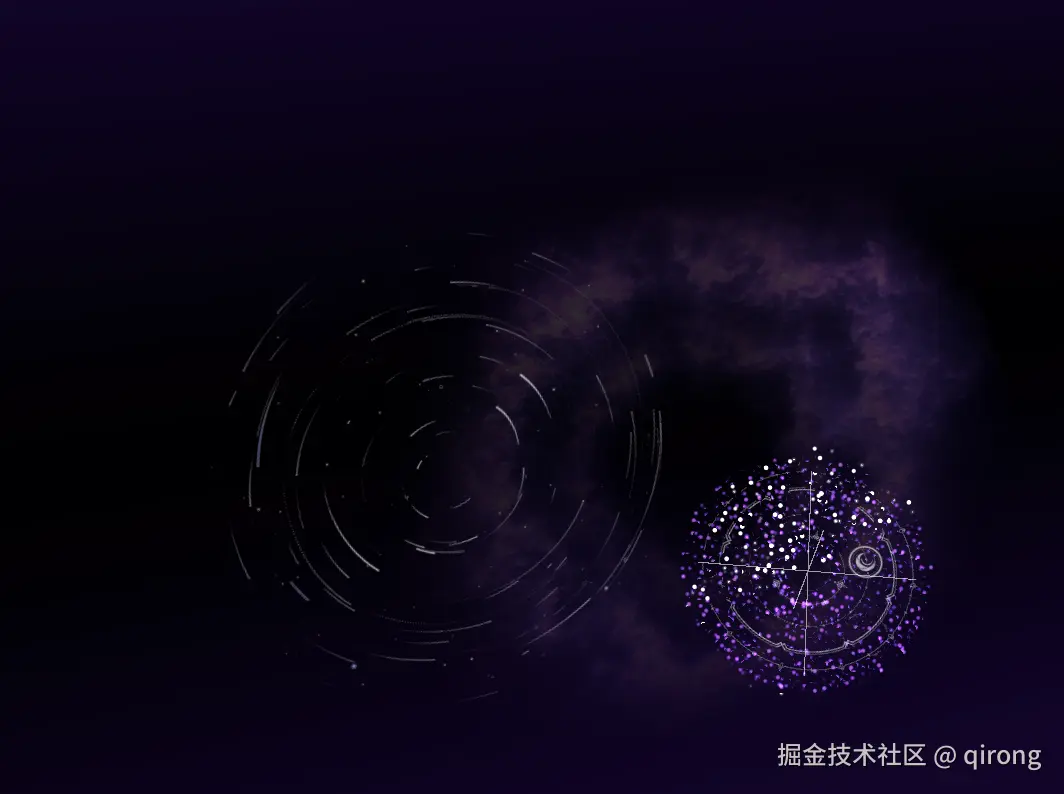 星环是整个场景中最复杂的部分之一。为了实现星环的动态旋转效果,需要创建了多个同心圆环,并为每个圆环添加了不同的旋转速度和方向。每个圆环由一系列点组成,这些点同样使用了自定义的着色器来实现发光和闪烁效果。