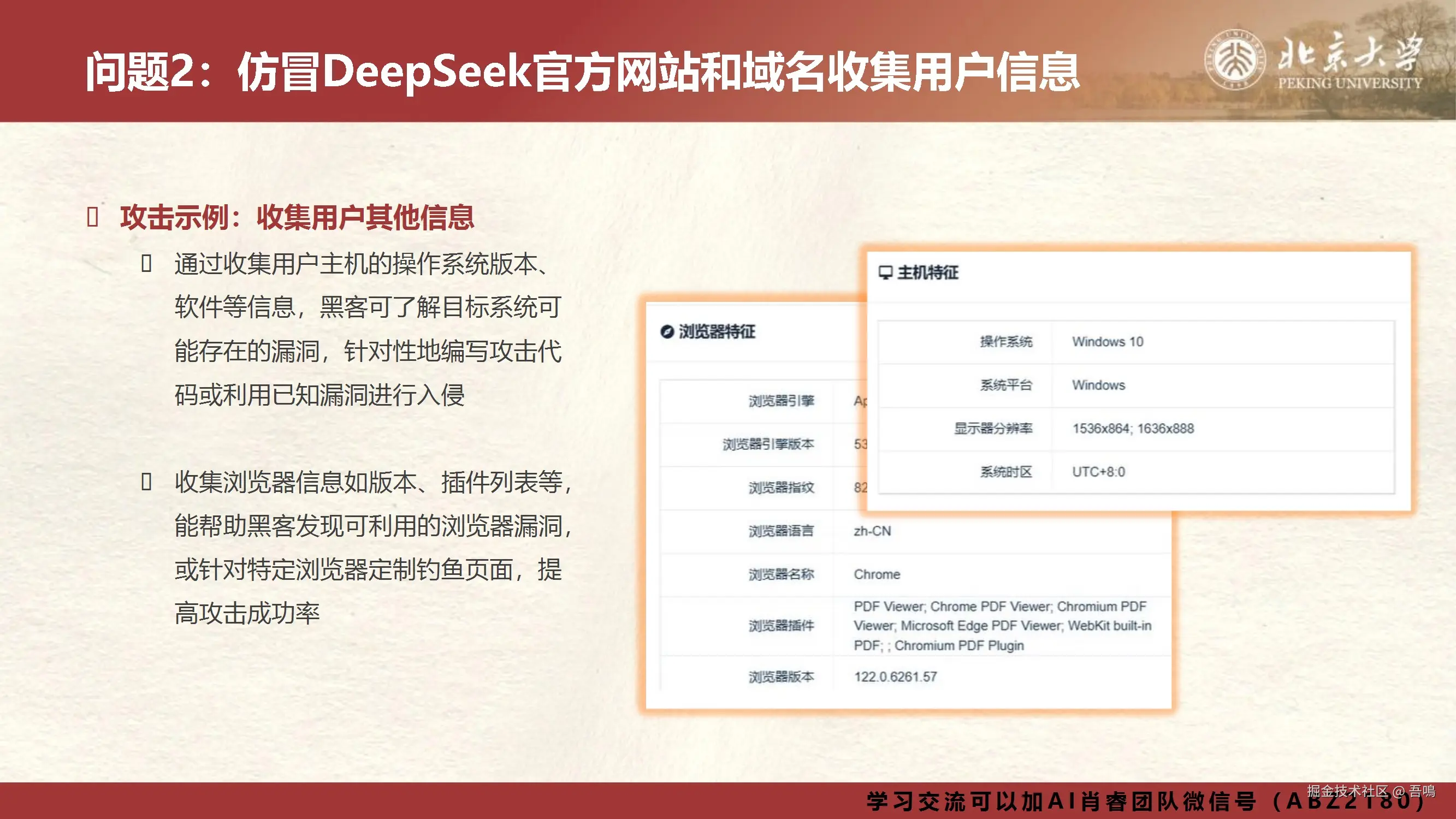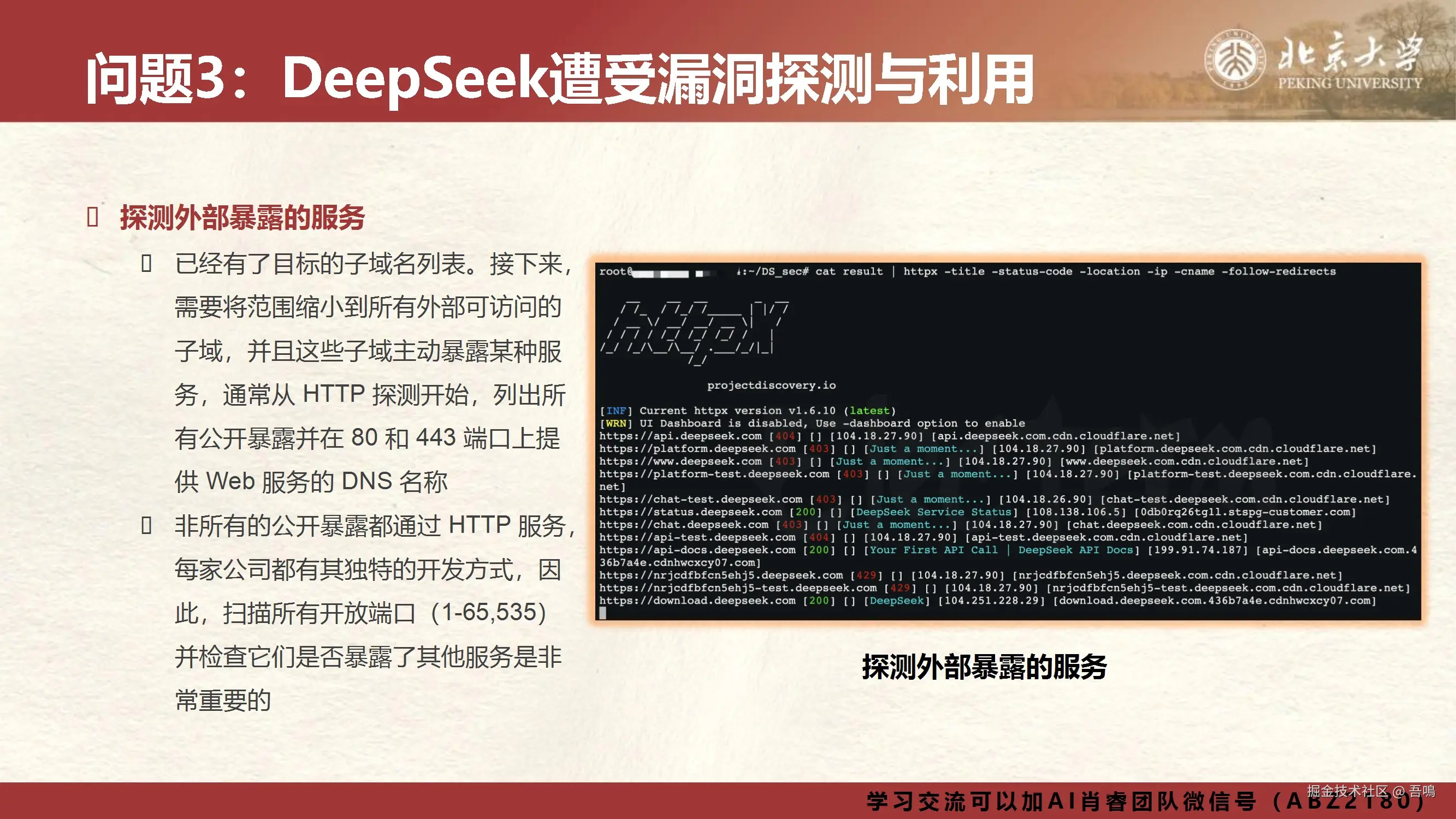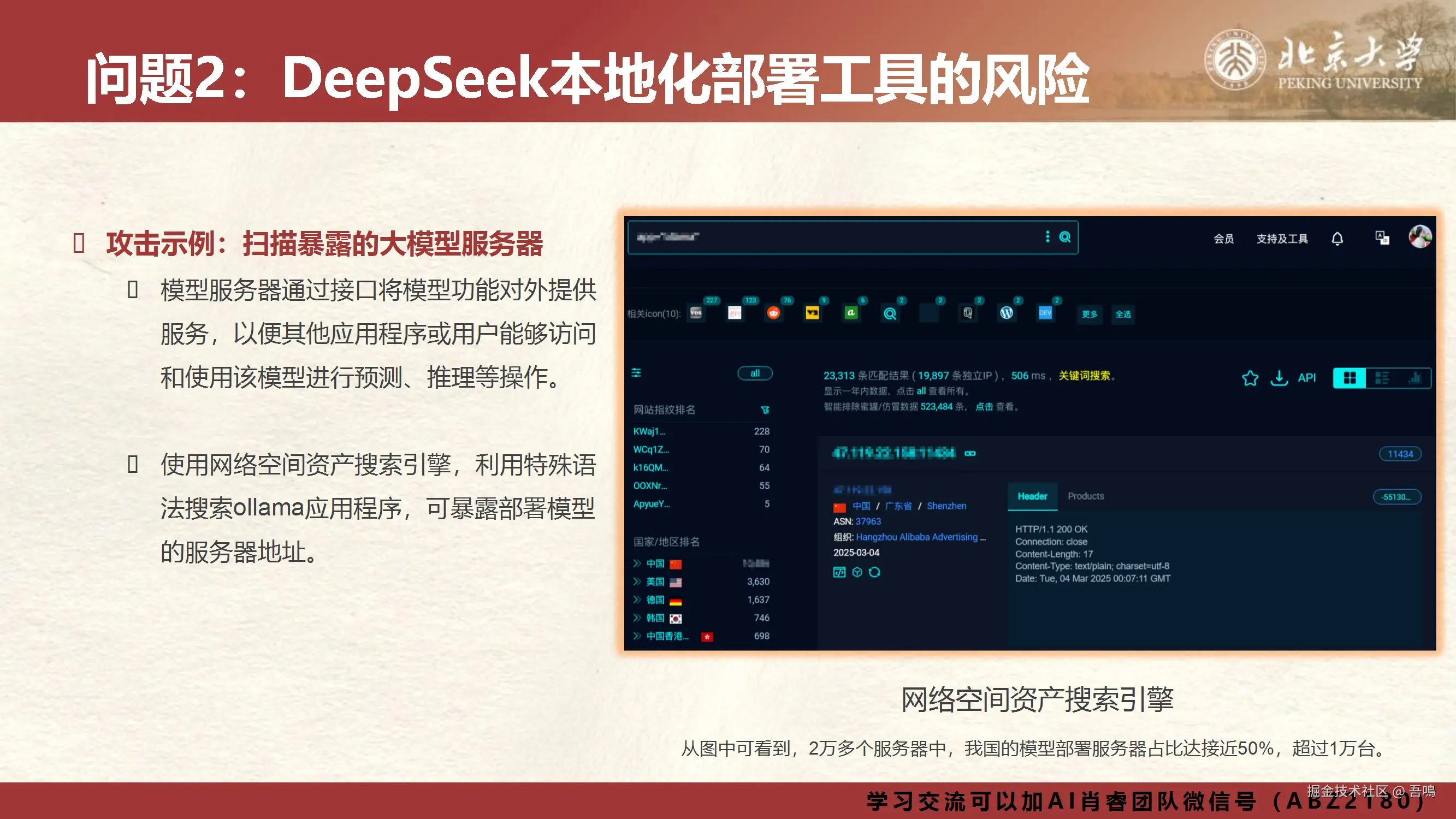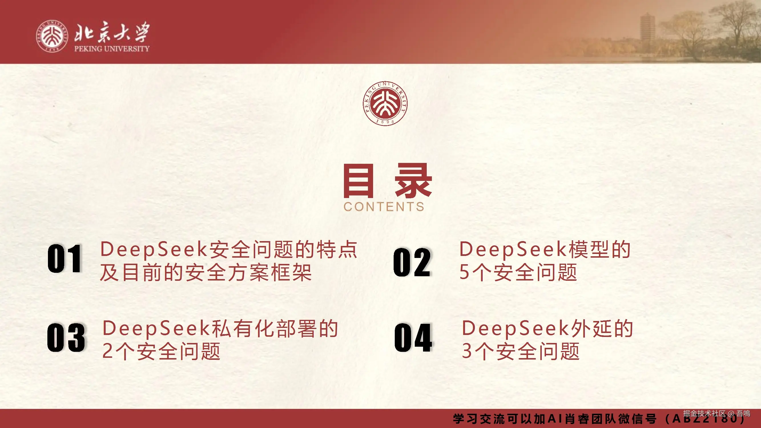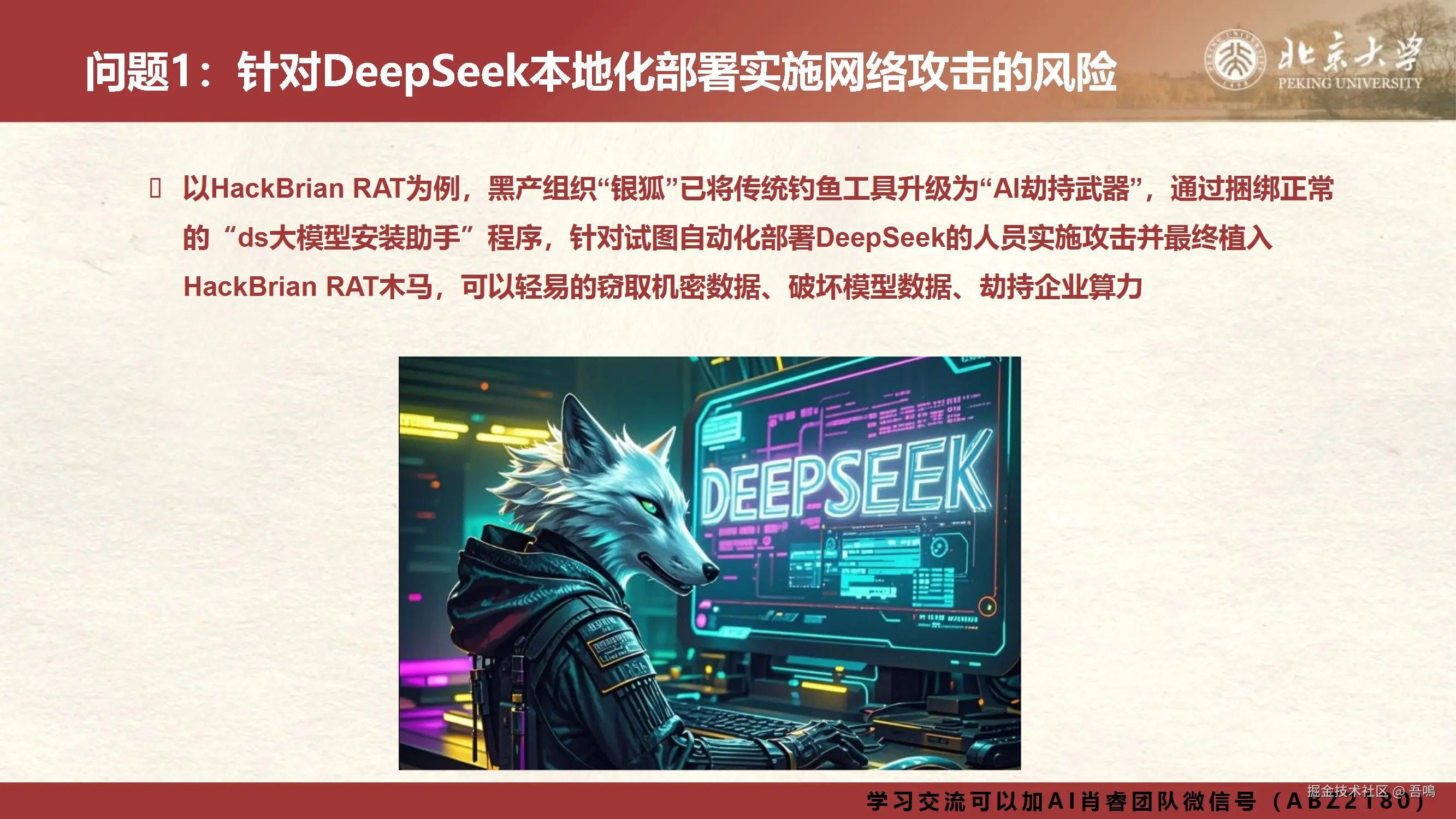 今天吾鳴发现北京大学又发布DeepSeek报告了,我们使用DeepSeek,需要考虑到数据隐私安全问题,然后我们本地部署DeepSeek也需要考虑到网络安全问题。包括在DeepSeek刚刚发布的时候,就遭受到了流量洪水攻击。北京大学的这份报告就是讲解关于DeepSeek应用场景中需要关注的十个安全问题以及我们需要如何防范。报告一共101页,文末有完整版下载地址。