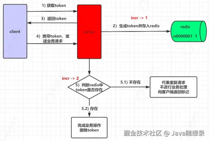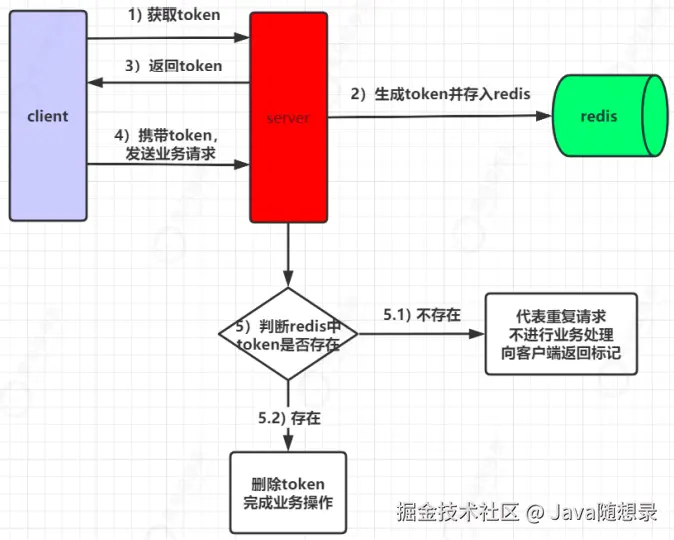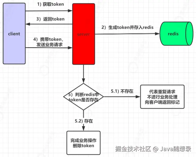 - 服务端接收到客户端请求后,首先会判断该 token 在 redis 中是否存在。如果存在,则完成进行业务处理,业务处理完成后,再删除 token。如果不存在,代表当前请求是重复请求,直接向客户端返回对应标识。