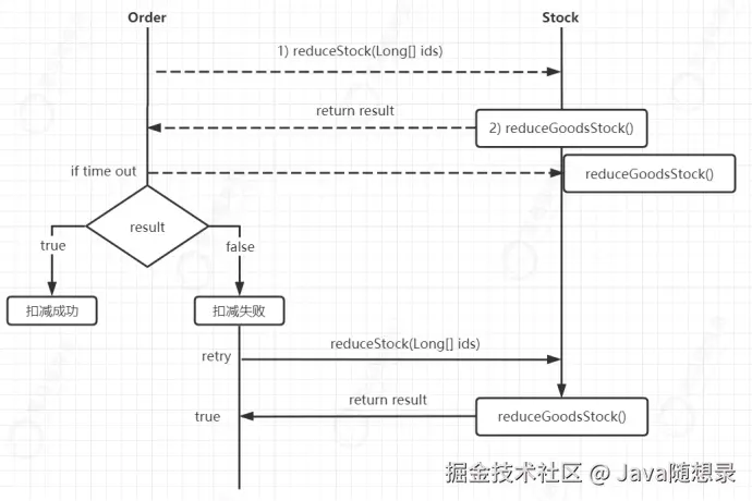 如果出现调用超时,如网络抖动,虽然库存服务执行成功了,但结果并没有在指定时间内返回,则订单服务会进行重试。那就会出现问题,此时出现库存扣减两次的问题。 对于这种问题,就需要考虑幂等性设计。