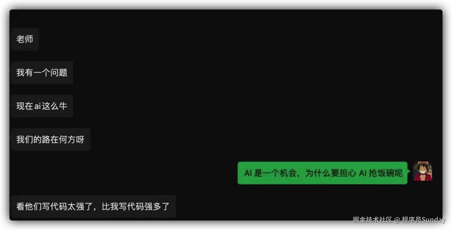 很多同学担心 AI 会取代程序员的一个核心前提是:我作为一个打工者,AI 的开发效率那么高,公司肯定不再需要那么多的程序员,所以我可能会失业。因此我担心 AI 会干掉程序员 。