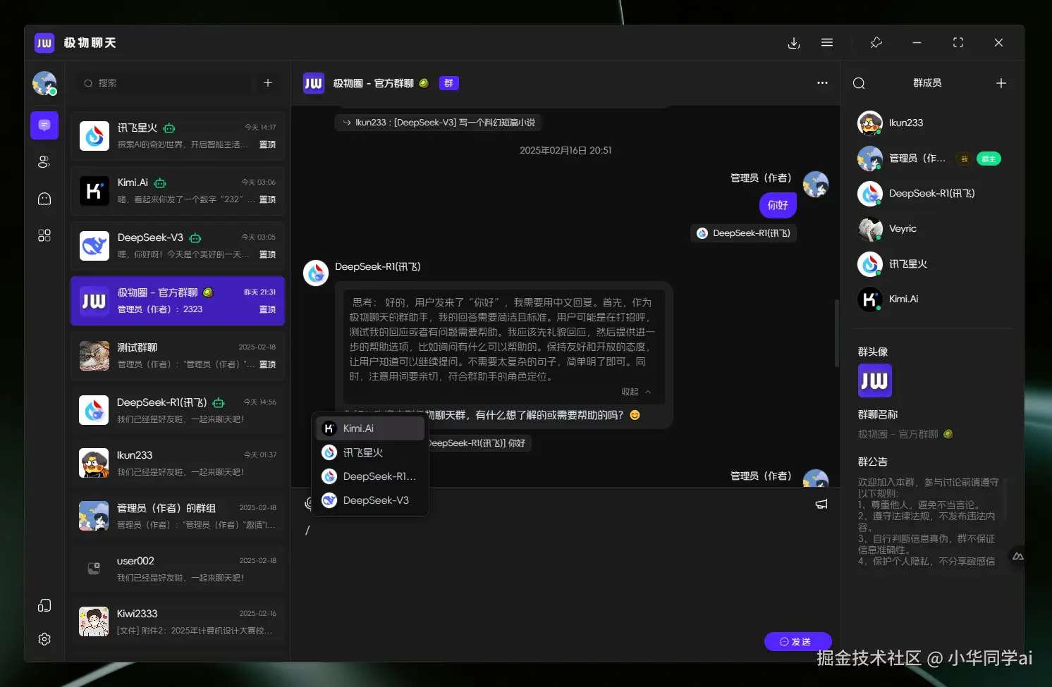 - 多AI自由切换:DeepSeek/讯飞星火/KimiAI三大主流AI同框竞技