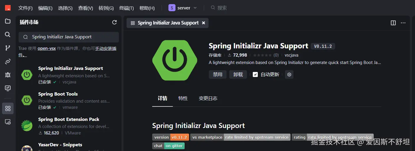插件安装: 安装 Spring Initializr Java Support,可以快速生成项目的脚手架。也可以把 Spring Boot Tools 插件一起安装