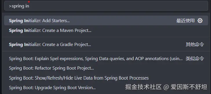 Ctrl + Shift + P 打开命令面板,输入 Spring Init 找到 Spring Boot 程序生成的命令,按提示选择构建工具、版本、java 版本、依赖包等信息,然后生成对应的基础工程框架。