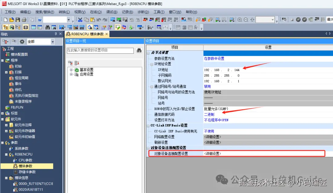 1、在导航中,通过参数>>R08ENCPU>> 模块参数,双击在打开的界面中设置好PLC的IP地址信息,将通信数据代码改成二进制,然后找到【对象设备连接配置设置】: