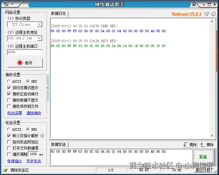 我们通过网络调试助手发送这个报文,观察一下返回的报文: